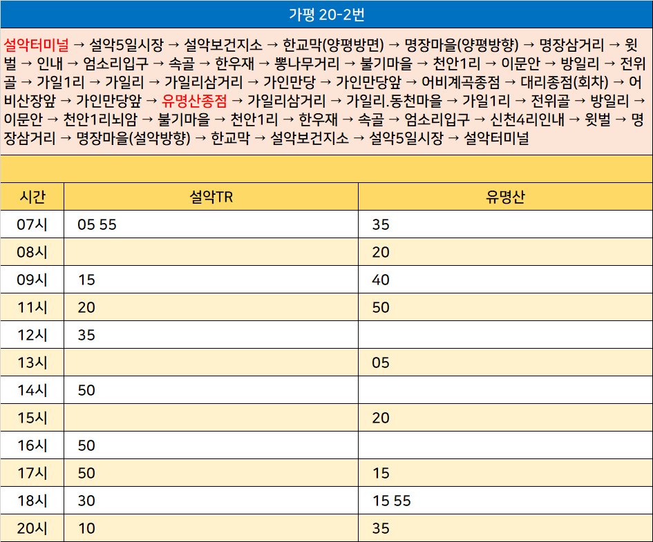 가평 20-2번: 설악터미널 → 설악5일시장 → 설악보건지소 → 한교막(양평방면) → 명장마을(양평방향) → 명장삼거리 → 윗벌 → 인내 → 엄소리입구 → 속골 → 한우재 → 뽕나무거리 → 불기마을 → 천안1리 → 이문안 → 방일리 → 전위골 → 가일1리 → 가일리 → 가일리삼거리 → 가인만당 → 가인만당앞 → 어비계곡종점 → 대리종점(회차) → 어비산장앞 → 가인만당앞 → 유명산종점 → 가일리삼거리 → 가일리.동천마을 → 가일1리 → 전위골 → 방일리 → 이문안 → 천안1리뇌암 → 불기마을 → 천안1리 → 한우재 → 속골 → 엄소리입구 → 신천4리인내 → 윗벌 → 명장삼거리 → 명장마을(설악방향) → 한교막 → 설악보건지소 → 설악5일시장 → 설악터미널