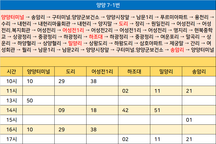 양양 7-1번: 양양터미널 → 송암리 → 구터미널.양양군보건소 → 양양시장앞 → 남문1리 → 푸르미아파트 → 용천리 → 수리 → 내현리 → 내현리마을회관 → 내현리 → 양지말 → 도리 → 장리 → 원일전리 → 어성전리 → 어성전리.복지회관 → 어성전리 → 어성전1리 → 어성전2리 → 어성전1리 → 어성전리 → 명지리 → 현북중학교 → 상광정리 → 중광정리 → 하광정리 → 하조대 → 하광정리 → 중광정리 → 여운포리 → 말곡리 → 상운리 → 하양혈리 → 상양혈리 → 밀양리 → 상왕도리 → 하왕도리 → 삼호아파트 → 제궁말 → 간리 → 여성회관 → 월리 → 남문1리 → 남문2리 → 양양시장앞 → 구터미널.양양군보건소 → 송암리 → 양양터미널