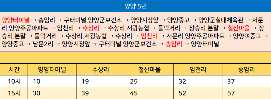 양양 5번: 양양터미널 → 송암리 → 구터미널.양양군보건소 → 양양시장앞 → 양양중고 → 양양군실내체육관 → 서문리.양양주공아파트 → 임천리 → 수상리 → 수상리.서광농협 → 들덕거리 → 장승리.본말 → 철산마을 → 장승리.본말 → 들덕거리 → 수상리.서광농협 → 수상리 → 임천리 → 서문리.양양주공아파트 → 양양여중고 → 양양중고 → 남문2리 → 양양시장앞 → 구터미널.양양군보건소 → 송암리 → 양양터미널