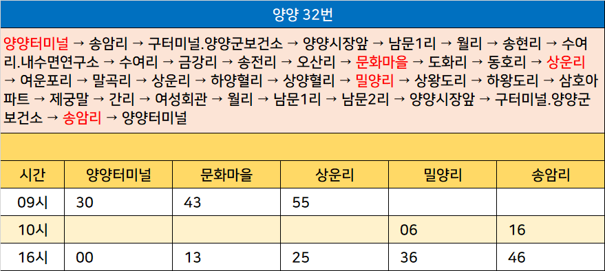 양양 32번: 양양터미널 → 송암리 → 구터미널.양양군보건소 → 양양시장앞 → 남문1리 → 월리 → 송현리 → 수여리.내수면연구소 → 수여리 → 금강리 → 송전리 → 오산리 → 문화마을 → 도화리 → 동호리 → 상운리 → 여운포리 → 말곡리 → 상운리 → 하양혈리 → 상양혈리 → 밀양리 → 상왕도리 → 하왕도리 → 삼호아파트 → 제궁말 → 간리 → 여성회관 → 월리 → 남문1리 → 남문2리 → 양양시장앞 → 구터미널.양양군보건소 → 송암리 → 양양터미널