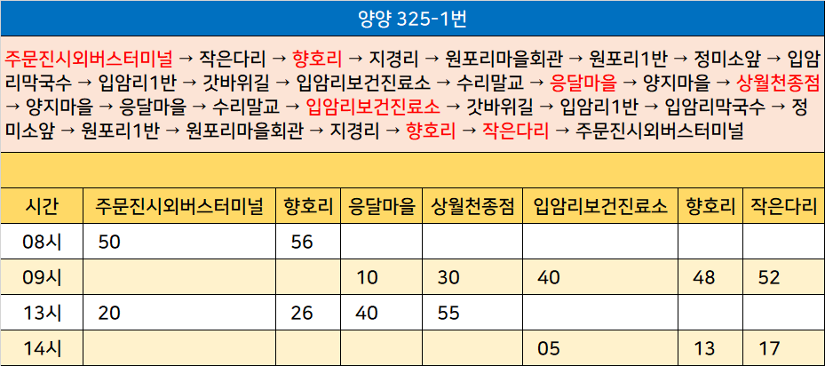 양양 325-1번: 주문진시외버스터미널 → 작은다리 → 향호리 → 지경리 → 원포리마을회관 → 원포리1반 → 정미소앞 → 입암리막국수 → 입암리1반 → 갓바위길 → 입암리보건진료소 → 수리말교 → 응달마을 → 양지마을 → 상월천종점 → 양지마을 → 응달마을 → 수리말교 → 입암리보건진료소 → 갓바위길 → 입암리1반 → 입암리막국수 → 정미소앞 → 원포리1반 → 원포리마을회관 → 지경리 → 향호리 → 작은다리 → 주문진시외버스터미널
