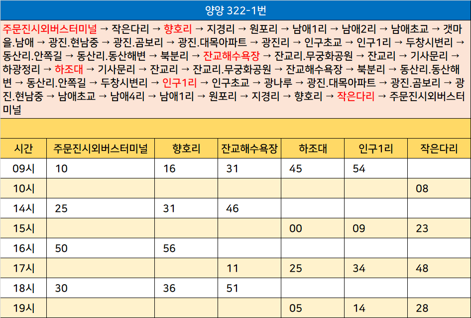 양양 322-1번: 주문진시외버스터미널 → 작은다리 → 향호리 → 지경리 → 원포리 → 남애1리 → 남애2리 → 남애초교 → 갯마을.남애 → 광진.현남중 → 광진.곰보리 → 광진.대목아파트 → 광진리 → 인구초교 → 인구1리 → 두창시변리 → 동산리.안쪽길 → 동산리.동산해변 → 북분리 → 잔교해수욕장 → 잔교리.무궁화공원 → 잔교리 → 기사문리 → 하광정리 → 하조대 → 기사문리 → 잔교리 → 잔교리.무궁화공원 → 잔교해수욕장 → 북분리 → 동산리.동산해변 → 동산리.안쪽길 → 두창시변리 → 인구1리 → 인구초교 → 광나루 → 광진.대목아파트 → 광진.곰보리 → 광진.현남중 → 남애초교 → 남애4리 → 남애1리 → 원포리 → 지경리 → 향호리 → 작은다리 → 주문진시외버스터미널