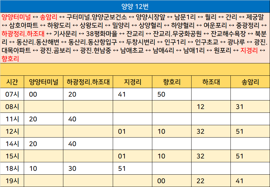 양양 12번: 양양터미널 ↔ 송암리 ↔ 구터미널.양양군보건소 ↔ 양양시장앞 ↔ 남문1리 ↔ 월리 ↔ 간리 ↔ 제궁말 ↔ 삼호아파트 ↔ 하왕도리 ↔ 상왕도리 ↔ 밀양리 ↔ 상양혈리 ↔ 하양혈리 ↔ 여운포리 ↔ 중광정리 ↔ 하광정리.하조대 ↔ 기사문리 ↔ 38평화마을 ↔ 잔교리 ↔ 잔교리.무궁화공원 ↔ 잔교해수욕장 ↔ 북분리 ↔ 동산리.동산해변 ↔ 동산리.동산항입구 ↔ 두창시변리 ↔ 인구1리 ↔ 인구초교 ↔ 광나루 ↔ 광진.대목아파트 ↔ 광진.곰보리 ↔ 광진.현남중 ↔ 남애초교 ↔ 남애4리 ↔ 남애1리 ↔ 원포리 ↔ 지경리 ↔ 향호리