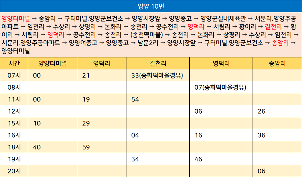 양양 10번: 양양터미널 → 송암리 → 구터미널.양양군보건소 → 양양시장앞 → 양양중고 → 양양군실내체육관 → 서문리.양양주공아파트 → 임천리 → 수상리 → 상평리 → 논화리 → 송천리 → 공수전리 → 영덕리 → 서림리 → 황이리 → 갈천리 → 황이리 → 서림리 → 영덕리 → 공수전리 → 송천리 → (송천떡마을) → 송천리 → 논화리 → 상평리 → 수상리 → 임천리 → 서문리.양양주공아파트 → 양양여중고 → 양양중고 → 남문2리 → 양양시장앞 → 구터미널.양양군보건소 → 송암리 → 양양터미널