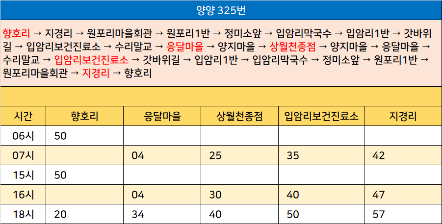 양양 325번: 향호리 → 지경리 → 원포리마을회관 → 원포리1반 → 정미소앞 → 입암리막국수 → 입암리1반 → 갓바위길 → 입암리보건진료소 → 수리말교 → 응달마을 → 양지마을 → 상월천종점 → 양지마을 → 응달마을 → 수리말교 → 입암리보건진료소 → 갓바위길 → 입암리1반 → 입암리막국수 → 정미소앞 → 원포리1반 → 원포리마을회관 → 지경리 → 향호리