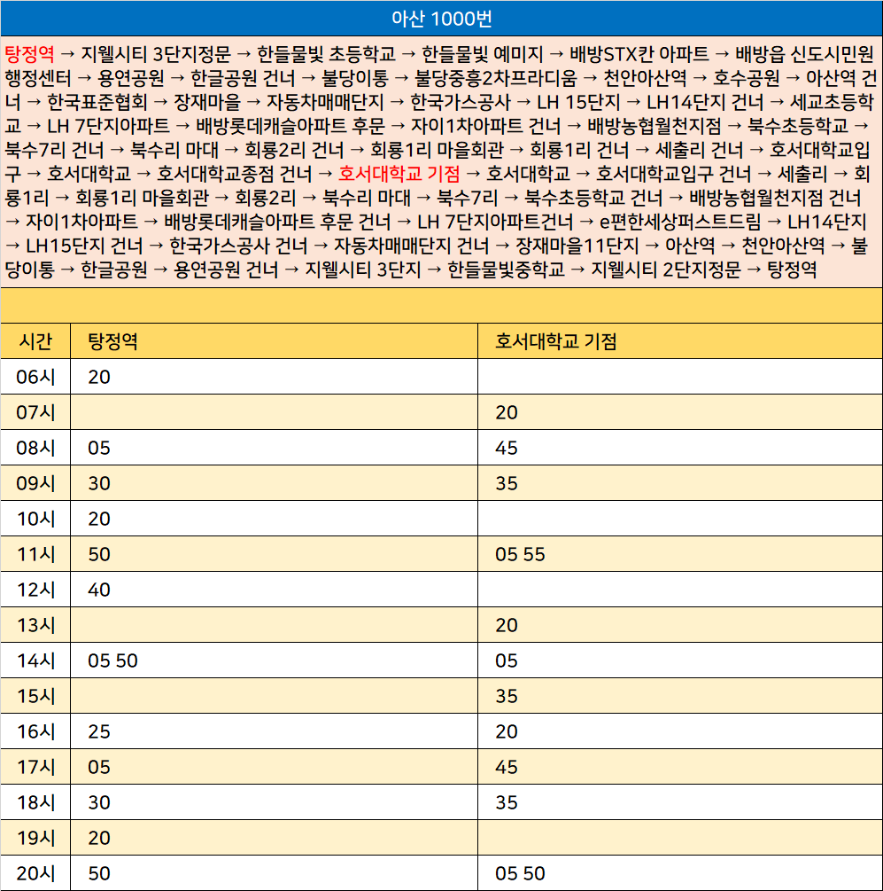 아산 1000번: 탕정역 → 지웰시티 3단지정문 → 한들물빛 초등학교 → 한들물빛 예미지 → 배방STX칸 아파트 → 배방읍 신도시민원행정센터 → 용연공원 → 한글공원 건너 → 불당이통 → 불당중흥2차프라디움 → 천안아산역 → 호수공원 → 아산역 건너 → 한국표준협회 → 장재마을 → 자동차매매단지 → 한국가스공사 → LH 15단지 → LH14단지 건너 → 세교초등학교 → LH 7단지아파트 → 배방롯데캐슬아파트 후문 → 자이1차아파트 건너 → 배방농협월천지점 → 북수초등학교 → 북수7리 건너 → 북수리 마대 → 회룡2리 건너 → 회룡1리 마을회관 → 회룡1리 건너 → 세출리 건너 → 호서대학교입구 → 호서대학교 → 호서대학교종점 건너 → 호서대학교 기점 → 호서대학교 → 호서대학교입구 건너 → 세출리 → 회룡1리 → 회룡1리 마을회관 → 회룡2리 → 북수리 마대 → 북수7리 → 북수초등학교 건너 → 배방농협월천지점 건너 → 자이1차아파트 → 배방롯데캐슬아파트 후문 건너 → LH 7단지아파트건너 → e편한세상퍼스트드림 → LH14단지 → LH15단지 건너 → 한국가스공사 건너 → 자동차매매단지 건너 → 장재마을11단지 → 아산역 → 천안아산역 → 불당이통 → 한글공원 → 용연공원 건너 → 지웰시티 3단지 → 한들물빛중학교 → 지웰시티 2단지정문 → 탕정역