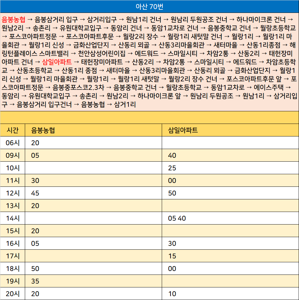 아산 70번: 음봉농협 → 음봉삼거리 입구 → 삼거리입구 → 원남1리 건너 → 원남리 두원공조 건너 → 하나마이크론 건너 → 원남2리 → 송촌리 → 유원대학교입구 → 동암리 건너 → 동암1교차로 건너 → 음봉중학교 건너 → 월랑초등학교 → 포스코아파트정문 → 포스코아파트후문 → 월랑2리 장수 → 월랑1리 새텃말 건너 → 월랑1리 → 월랑1리 마을회관 → 월랑1리 신성 → 금화산업단지 → 산동리 뫼골 → 산동3리마을회관 → 새터마을 → 산동1리종점 → 해링턴플레이스 스마트밸리 → 천안삼성어린이집 → 에드워드 → 스마일시티 → 차암2통 → 산동2리 → 태헌장미아파트 건너 → 삼일아파트 → 태헌장미아파트 → 산동2리 → 차암2통 → 스마일시티 → 에드워드 → 차암초등학교 → 산동초등학교 → 산동1리 종점 → 새터마을 → 산동3리마을회관 → 산동리 뫼골 → 금화산업단지 → 월랑1리 신성 → 월랑1리 마을회관 → 월랑1리 → 월랑1리 새텃말 → 월랑2리 장수 건너 → 포스코아파트후문 앞 → 포스코아파트정문 → 음봉중포스코2.3차 → 음봉중학교 건너 → 월랑초등학교 → 동암1교차로 → 에이스주택 → 동암리 → 유원대학교입구 → 송촌리 → 원남2리 → 하나마이크론 앞 → 원남리 두원공조 → 원남1리 → 삼거리입구 → 음봉삼거리 입구건너 → 음봉농협 → 삼거1리