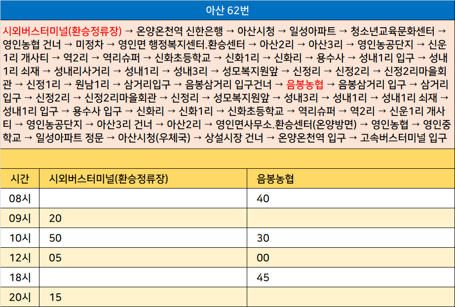 아산 62번: 시외버스터미널(환승정류장) → 온양온천역 신한은행 → 아산시청 → 일성아파트 → 청소년교육문화센터 → 영인농협 건너 → 영인면 행정복지센터.환승센터 → 아산2리 → 아산3리 → 영인농공단지 → 신운1리 개사티 → 역2리 → 역리슈퍼 → 신화초등학교 → 신화1리 → 신화리 → 용수사 → 성내1리 입구 → 성내1리 쇠재 → 성내리사거리 → 성내1리 → 성내3리 → 성모복지원앞 → 신정리 → 신정2리 → 신정2리마을회관 → 신정1리 → 원남1리 → 삼거리입구 → 음봉삼거리 입구건너 → 음봉농협 → 음봉삼거리 입구 → 삼거리입구 → 신정2리 → 신정2리마을회관 → 신정리 → 성모복지원앞 → 성내3리 → 성내1리 → 성내1리 쇠재 → 성내1리 입구 → 용수사 입구 → 신화리 → 신화1리 → 신화초등학교 → 역리슈퍼 → 역2리 → 신운1리 개사티 → 영인농공단지 → 아산3리 건너 → 아산2리 → 영인면사무소.환승센터(온양방면) → 영인농협 → 영인중학교 → 일성아파트 정문 → 아산시청(우체국) → 상설시장 건너 → 온양온천역 입구 → 고속버스터미널 입구