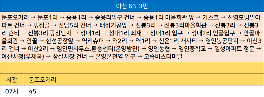 아산 63-3번: 둔포오거리 → 둔포1리 → 송용1리 → 송용리입구 건너 → 송용1리 마을회관 앞 → 가스코 → 신영모닝빌아파트 건너 → 냉정골 → 신남5리 건너 → 태정기공앞 → 신봉3리 → 신봉3리마을회관 → 신봉3리 → 신봉3리 흔티 → 신봉3리 공장단지 → 성내1리 → 성내1리 쇠재 → 성내1리 입구 → 성내2리 안골입구 → 안골마을회관 → 안골 → 한성공장앞 → 역리슈퍼 → 역2리 → 역1리 → 신운1리 개사티 → 영인농공단지 → 아산3리 건너 → 아산2리 → 영인면사무소.환승센터(온양방면) → 영인농협 → 영인중학교 → 일성아파트 정문 → 아산시청(우체국) → 상설시장 건너 → 온양온천역 입구 → 고속버스터미널