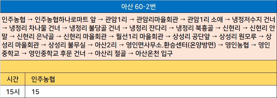 아산 60-2번: 인주농협 → 인주농협하나로마트 앞 → 관암1리 → 관암리마을회관 → 관암1리 소애 → 냉정저수지 건너 → 냉정리 차나물 건너 → 냉정리 불당골 건너 → 냉정리 잔다리 → 냉정리 북흥골 → 신현리 → 신현리 안말 → 신현리 은낙골 → 신현리 마을회관 → 월선1리 마을회관 → 상성리 공단앞 → 상성리 원모루 → 상성리 마을회관 → 상성리 불무실 → 아산2리 → 영인면사무소.환승센터(온양방면) → 영인농협 → 영인중학교 → 영인중학교 후문 건너 → 아산리 절골 → 아산온천 입구
