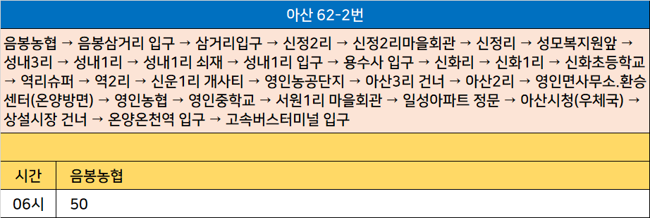 아산 62-2번: 음봉농협 → 음봉삼거리 입구 → 삼거리입구 → 신정2리 → 신정2리마을회관 → 신정리 → 성모복지원앞 → 성내3리 → 성내1리 → 성내1리 쇠재 → 성내1리 입구 → 용수사 입구 → 신화리 → 신화1리 → 신화초등학교 → 역리슈퍼 → 역2리 → 신운1리 개사티 → 영인농공단지 → 아산3리 건너 → 아산2리 → 영인면사무소.환승센터(온양방면) → 영인농협 → 영인중학교 → 서원1리 마을회관 → 일성아파트 정문 → 아산시청(우체국) → 상설시장 건너 → 온양온천역 입구 → 고속버스터미널 입구