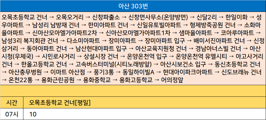 아산 303번: 오목초등학교 건너 → 오목오거리 → 신창파출소 → 신창면사무소(온양방면) → 신달2리 → 한일이화 → 성우아파트 → 남성리 남방재 건너 → 한미아파트 건너 → 신일유토빌아파트 → 형제방죽공원 건너 → 소화마을아파트 → 신아산모아엘가아파트2차 → 신아산모아엘가아파트1차 → 샘마을아파트 → 코아루아파트 → 남성3리 복지회관 건너 → 다소미아파트 → 장미아파트 → 장미아파트 입구 → 배미서진아파트 건너 → 신정삼거리 → 동아아파트 건너 → 남산현대아파트 입구 → 아산교육지원청 건너 → 경남아너스빌 건너 → 아산시청(우체국) → 시민로사거리 → 상설시장 건너 → 온양온천역 입구 → 온양온천역 유엘시티 → 아고사거리 건너 → 한올고등학교 건너 → 고속버스터미널(시티노래방앞) → 아산시보건소 입구 → 동신초등학교 건너 → 아산충무병원 → 이마트 아산점 → 풍기3통 → 동일하이빌A → 현대아이파크아파트 → 신도브래뉴 건너 → 온천22통 → 용화근린공원 → 용화중학교 → 용화고등학교 → 어의정앞