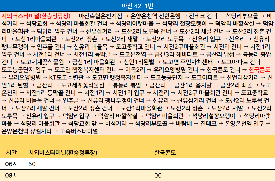 아산 42-1번: 시외버스터미널(환승정류장) → 아산축협온천지점 → 온양온천역 신한은행 → 진테크 건너 → 석당리부모골 → 비석거리 → 석당교회 → 석당리 마을회관 건너 → 석당리아랫마을 → 석당리 철장모랭이 → 덕암리 바깥삭실 → 덕암리마을회관 → 덕암리 입구 건너 → 신유삼거리 → 도산2리 노루목 건너 → 도산2리 새말 건너 → 도산2리 정촌 건너 → 도산1리마을회관 → 도산2리 정촌 → 도산2리 새말 → 도산2리 노루목 → 신유리 입구 → 신유리 → 신유리 팽나무갱이 → 인추골 건너 → 신유리 버들목 → 도고중학교 건너 → 시전2구마을회관 → 시전리 건너 → 시전1리 입구 건너 → 시전1리 건너 → 시전1리 동막골 → 도고온천역 → 금산3리 해비타트 → 금산리 남성 → 봉농리 봉암 건너 → 도고세계꽃식물원 → 금산1리 마을회관 → 신언1리된벌 → 도고면 주민자치센터 → 도고아파트 건너 → 도고농공단지 입구 → 도고면 행정복지센터 건너 → 기곡2리 → 유리요양병원 건너 → 한국콘도 건너 → 한국콘도 → 유리요양병원 → KT도고수련관 → 도고면 행정복지센터 → 도고농공단지 → 도고아파트 → 신언리삼거리 → 신언1리 된벌 → 금산리 → 도고세계꽃식물원 → 봉농리 봉암 → 금산리 → 금산1리 음지말 → 금산2리 쇠골 → 도고온천역 → 시전1리 동막골 건너 → 시전1리 → 시전1리 입구 → 시전리 → 시전2구 마을회관 건너 → 도고중학교 → 신유리 버들목 건너 → 인추골 → 신유리 팽나무갱이 건너 → 신유리 → 신유삼거리 건너 → 도산2리 노루목 건너 → 도산2리 새말 건너 → 도산2리 정촌 건너 → 도산1리마을회관 → 도산2리 정촌 → 도산2리 새말 → 도산2리 노루목 → 신유리 입구 → 덕암리입구 → 덕암리 바깥삭실 → 덕암리마을회관 → 석당리철장모랭이 → 석당리아랫마을 → 석당리 마을회관 → 석당교회 앞 → 비석거리 → 석당리부모골 → 바람내 → 진테크 → 온양온천역 입구 → 온양온천역 유엘시티 → 고속버스터미널