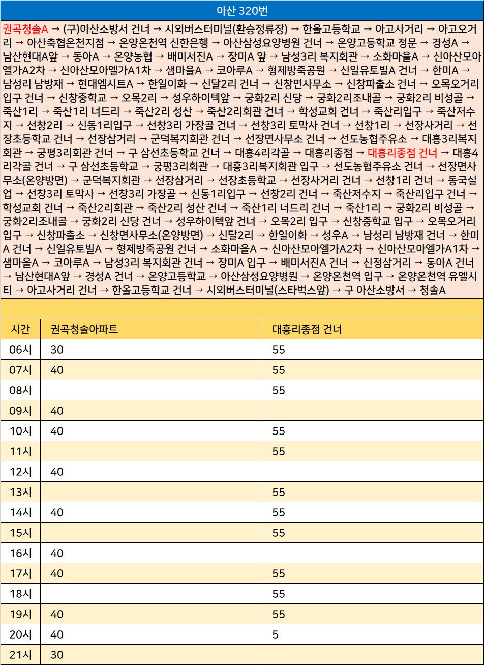 아산 320번: 권곡청솔A → (구)아산소방서 건너 → 시외버스터미널(환승정류장) → 한올고등학교 → 아고사거리 → 아고오거리 → 아산축협온천지점 → 온양온천역 신한은행 → 아산삼성요양병원 건너 → 온양고등학교 정문 → 경성A → 남산현대A앞 → 동아A → 온양농협 → 배미서진A → 장미A 앞 → 남성3리 복지회관 → 소화마을A → 신아산모아엘가A2차 → 신아산모아엘가A1차 → 샘마을A → 코아루A → 형제방죽공원 → 신일유토빌A 건너 → 한미A → 남성리 남방재 → 현대엠시트A → 한일이화 → 신달2리 건너 → 신창면사무소 → 신창파출소 건너 → 오목오거리 입구 건너 → 신창중학교 → 오목2리 → 성우하이텍앞 → 궁화2리 신당 → 궁화2리조내골 → 궁화2리 비성골 → 죽산1리 → 죽산1리 너드리 → 죽산2리 성산 → 죽산2리회관 건너 → 학성교회 건너 → 죽산리입구 → 죽산저수지 → 선창2리 → 신동1리입구 → 선창3리 가장골 건너 → 선창3리 토막사 건너 → 선창1리 → 선장사거리 → 선장초등학교 건너 → 선장삼거리 → 군덕복지회관 건너 → 선장면사무소 건너 → 선도농협주유소 → 대흥3리복지회관 → 궁평3리회관 건너 → 구 삼선초등학교 건너 → 대흥4리각골 → 대흥리종점 → 대흥리종점 건너 → 대흥4리각골 건너 → 구 삼선초등학교 → 궁평3리회관 → 대흥3리복지회관 입구 → 선도농협주유소 건너 → 선장면사무소(온양방면) → 군덕복지회관 → 선장삼거리 → 선장초등학교 → 선장사거리 건너 → 선창1리 건너 → 동국실업 → 선창3리 토막사 → 선창3리 가장골 → 신동1리입구 → 선창2리 건너 → 죽산저수지 → 죽산리입구 건너 → 학성교회 건너 → 죽산2리회관 → 죽산2리 성산 건너 → 죽산1리 너드리 건너 → 죽산1리 → 궁화2리 비성골 → 궁화2리조내골 → 궁화2리 신당 건너 → 성우하이텍앞 건너 → 오목2리 입구 → 신창중학교 입구 → 오목오거리 입구 → 신창파출소 → 신창면사무소(온양방면) → 신달2리 → 한일이화 → 성우A → 남성리 남방재 건너 → 한미A 건너 → 신일유토빌A → 형제방죽공원 건너 → 소화마을A → 신아산모아엘가A2차 → 신아산모아엘가A1차 → 샘마을A → 코아루A → 남성3리 복지회관 건너 → 장미A 입구 → 배미서진A 건너 → 신정삼거리 → 동아A 건너 → 남산현대A앞 → 경성A 건너 → 온양고등학교 → 아산삼성요양병원 → 온양온천역 입구 → 온양온천역 유엘시티 → 아고사거리 건너 → 한올고등학교 건너 → 시외버스터미널(스타벅스앞) → 구 아산소방서 → 청솔A