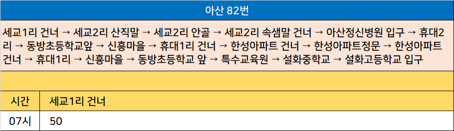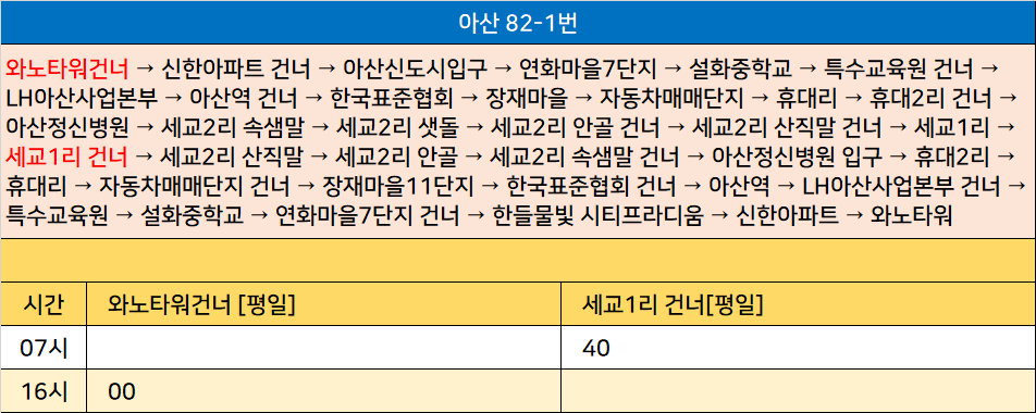 아산 82-1번: 와노타워건너 → 신한아파트 건너 → 아산신도시입구 → 연화마을7단지 → 설화중학교 → 특수교육원 건너 → LH아산사업본부 → 아산역 건너 → 한국표준협회 → 장재마을 → 자동차매매단지 → 휴대리 → 휴대2리 건너 → 아산정신병원 → 세교2리 속샘말 → 세교2리 샛돌 → 세교2리 안골 건너 → 세교2리 산직말 건너 → 세교1리 → 세교1리 건너 → 세교2리 산직말 → 세교2리 안골 → 세교2리 속샘말 건너 → 아산정신병원 입구 → 휴대2리 → 휴대리 → 자동차매매단지 건너 → 장재마을11단지 → 한국표준협회 건너 → 아산역 → LH아산사업본부 건너 → 특수교육원 → 설화중학교 → 연화마을7단지 건너 → 한들물빛 시티프라디움 → 신한아파트 → 와노타워