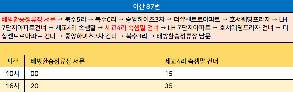 아산 87번: 배방환승정류장 서문 → 북수5리 → 북수6리 → 중앙하이츠3차 → 더샵센트로아파트 → 호서웨딩프라자 → LH 7단지아파트건너 → 세교4리 속셈말 → 세교4리 속셈말 건너 → LH 7단지아파트 → 호서웨딩프라자 건너 → 더샵센트로아파트 건너 → 중앙하이츠3차 건너 → 북수3리 → 배방환승정류장 남문