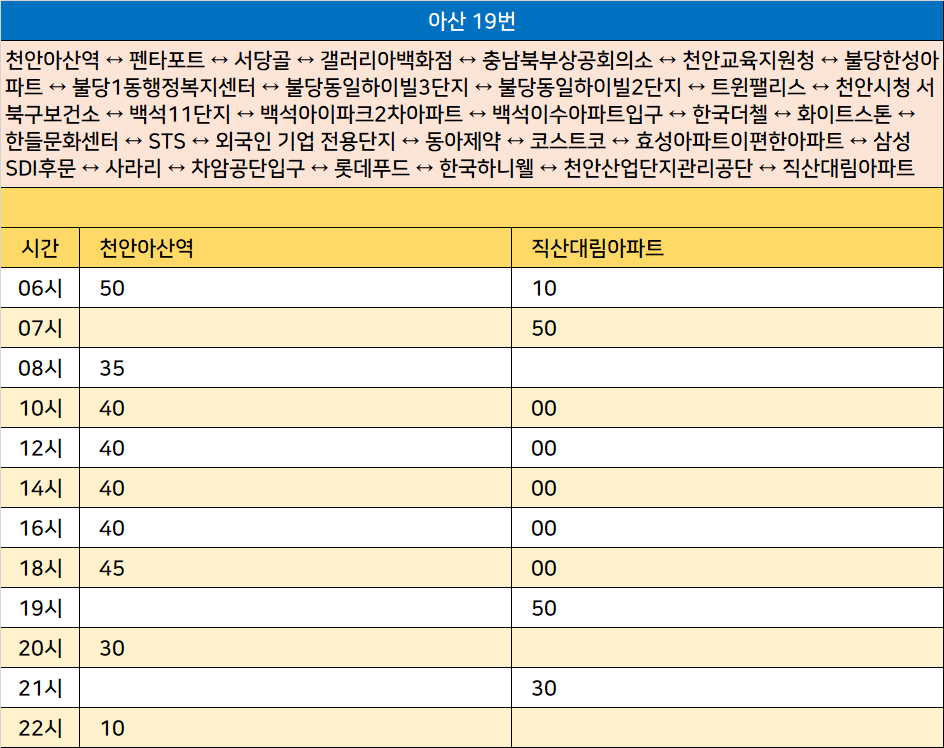 아산 19번: 천안아산역 ↔ 펜타포트 ↔ 서당골 ↔ 갤러리아백화점 ↔ 충남북부상공회의소 ↔ 천안교육지원청 ↔ 불당한성아파트 ↔ 불당1동행정복지센터 ↔ 불당동일하이빌3단지 ↔ 불당동일하이빌2단지 ↔ 트윈팰리스 ↔ 천안시청 서북구보건소 ↔ 백석11단지 ↔ 백석아이파크2차아파트 ↔ 백석이수아파트입구 ↔ 한국더첼 ↔ 화이트스톤 ↔ 한들문화센터 ↔ STS ↔ 외국인 기업 전용단지 ↔ 동아제약 ↔ 코스트코 ↔ 효성아파트이편한아파트 ↔ 삼성SDI후문 ↔ 사라리 ↔ 차암공단입구 ↔ 롯데푸드 ↔ 한국하니웰 ↔ 천안산업단지관리공단 ↔ 직산대림아파트