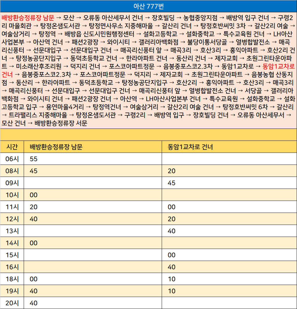 아산 777번: 배방환승정류장 남문 → 모산 → 오류동 아산세무서 건너 → 장호빌딩 → 농협중앙지점 → 배방역 입구 건너 → 구령2리 마을회관 → 탕정온샘도서관 → 탕정면사무소 지중해마을 → 갈산리 건너 → 탕정호반써밋 3차 → 갈산2리 여술 → 여술삼거리 → 탕정역 → 배방읍 신도시민원행정센터 → 설화고등학교 → 설화중학교 → 특수교육원 건너 → LH아산사업본부 → 아산역 건너 → 패션2광장 → 와이시티 → 갤러리아백화점 → 불당이통서당골 → 열병합발전소 → 매곡리신풍터 → 선문대입구 → 선문대입구 건너 → 매곡리신풍터 앞 → 매곡3리 → 호산3리 → 홍익아파트 → 호산2리 건너 → 탕정농공단지입구 → 동덕초등학교 건너 → 한라아파트 건너 → 동산리 건너 → 제자교회 → 초원그린타운아파트 → 미소래산후조리원 → 덕지리 건너 → 포스코아파트정문 → 음봉중포스코2.3차 → 동암1교차로 → 동암1교차로 건너 → 음봉중포스코2.3차 → 포스코아파트정문 → 덕지리 → 제자교회 → 초원그린타운아파트 → 음봉농협 산동지점 → 동산리 → 한라아파트 → 동덕초등학교 → 탕정농공단지입구 → 호산2리 → 홍익아파트 → 호산3리 → 매곡3리 → 매곡리신풍터 → 선문대입구 → 선문대입구 건너 → 매곡리신풍터 앞 → 열병합발전소 건너 → 서당골 → 갤러리아백화점 → 와이시티 건너 → 패션2광장 건너 → 아산역 → LH아산사업본부 건너 → 특수교육원 → 설화중학교 → 설화고등학교 입구 → 용연마을4거리 → 탕정역건너 → 여술삼거리 → 갈산2리 여술 건너 → 탕정호반써밋 6차 → 갈산리 → 트라팰리스 지중해마을 → 탕정온샘도서관 → 구령2리 → 배방역 입구 → 장호빌딩 건너 → 오류동 아산세무서 → 모산 건너 → 배방환승정류장 서문