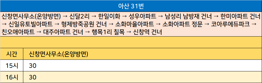 아산 31번: 신창면사무소(온양방면) → 신달2리 → 한일이화 → 성우아파트 → 남성리 남방재 건너 → 한미아파트 건너 → 신일유토빌아파트 → 형제방죽공원 건너 → 소화마을아파트 → 소화아파트 정문 → 코아루에듀파크 → 친오애아파트 → 대주아파트 건너 → 행목1리 칠목 → 신창역 건너