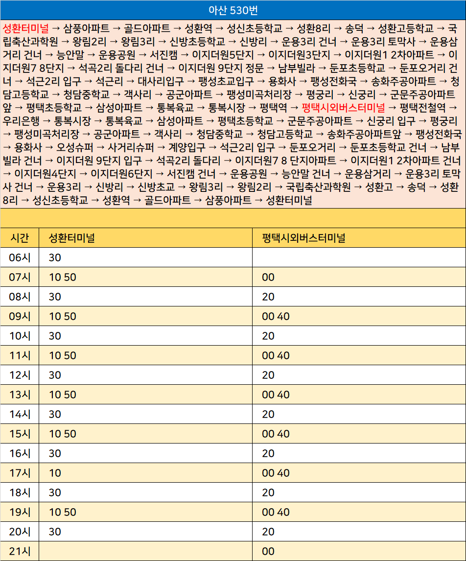 아산 530번: 성환터미널 → 삼풍아파트 → 골드아파트 → 성환역 → 성신초등학교 → 성환8리 → 송덕 → 성환고등학교 → 국립축산과학원 → 왕림2리 → 왕림3리 → 신방초등학교 → 신방리 → 운용3리 건너 → 운용3리 토막사 → 운용삼거리 건너 → 능안말 → 운용공원 → 서진캠 → 이지더원5단지 → 이지더원3단지 → 이지더원1 2차아파트 → 이지더원7 8단지 → 석곡2리 돌다리 건너 → 이지더원 9단지 정문 → 남부빌라 → 둔포초등학교 → 둔포오거리 건너 → 석근2리 입구 → 석근리 → 대사리입구 → 팽성초교입구 → 용화사 → 팽성전화국 → 송화주공아파트 → 청담고등학교 → 청담중학교 → 객사리 → 공군아파트 → 팽성미곡처리장 → 평궁리 → 신궁리 → 군문주공아파트앞 → 평택초등학교 → 삼성아파트 → 통복육교 → 통복시장 → 평택역 → 평택시외버스터미널 → 평택전철역 → 우리은행 → 통복시장 → 통복육교 → 삼성아파트 → 평택초등학교 → 군문주공아파트 → 신궁리 입구 → 평궁리 → 팽성미곡처리장 → 공군아파트 → 객사리 → 청담중학교 → 청담고등학교 → 송화주공아파트앞 → 팽성전화국 → 용화사 → 오성슈퍼 → 사거리슈퍼 → 계양입구 → 석근2리 입구 → 둔포오거리 → 둔포초등학교 건너 → 남부빌라 건너 → 이지더원 9단지 입구 → 석곡2리 돌다리 → 이지더원7 8 단지아파트 → 이지더원1 2차아파트 건너 → 이지더원4단지 → 이지더원6단지 → 서진캠 건너 → 운용공원 → 능안말 건너 → 운용삼거리 → 운용3리 토막사 건너 → 운용3리 → 신방리 → 신방초교 → 왕림3리 → 왕림2리 → 국립축산과학원 → 성환고 → 송덕 → 성환8리 → 성신초등학교 → 성환역 → 골드아파트 → 삼풍아파트 → 성환터미널