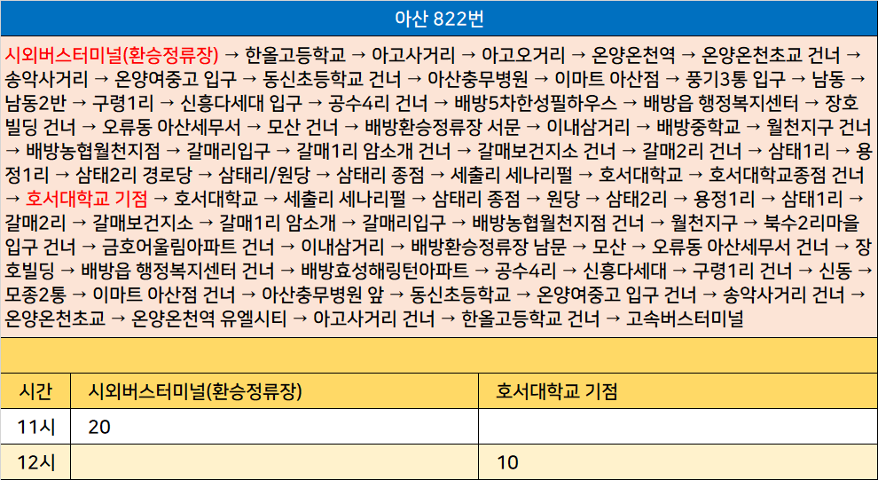 아산 822번: 시외버스터미널(환승정류장) → 한올고등학교 → 아고사거리 → 아고오거리 → 온양온천역 → 온양온천초교 건너 → 송악사거리 → 온양여중고 입구 → 동신초등학교 건너 → 아산충무병원 → 이마트 아산점 → 풍기3통 입구 → 남동 → 남동2반 → 구령1리 → 신흥다세대 입구 → 공수4리 건너 → 배방5차한성필하우스 → 배방읍 행정복지센터 → 장호빌딩 건너 → 오류동 아산세무서 → 모산 건너 → 배방환승정류장 서문 → 이내삼거리 → 배방중학교 → 월천지구 건너 → 배방농협월천지점 → 갈매리입구 → 갈매1리 암소개 건너 → 갈매보건지소 건너 → 갈매2리 건너 → 삼태1리 → 용정1리 → 삼태2리 경로당 → 삼태리/원당 → 삼태리 종점 → 세출리 세나리펄 → 호서대학교 → 호서대학교종점 건너 → 호서대학교 기점 → 호서대학교 → 세출리 세나리펄 → 삼태리 종점 → 원당 → 삼태2리 → 용정1리 → 삼태1리 → 갈매2리 → 갈매보건지소 → 갈매1리 암소개 → 갈매리입구 → 배방농협월천지점 건너 → 월천지구 → 북수2리마을입구 건너 → 금호어울림아파트 건너 → 이내삼거리 → 배방환승정류장 남문 → 모산 → 오류동 아산세무서 건너 → 장호빌딩 → 배방읍 행정복지센터 건너 → 배방효성해링턴아파트 → 공수4리 → 신흥다세대 → 구령1리 건너 → 신동 → 모종2통 → 이마트 아산점 건너 → 아산충무병원 앞 → 동신초등학교 → 온양여중고 입구 건너 → 송악사거리 건너 → 온양온천초교 → 온양온천역 유엘시티 → 아고사거리 건너 → 한올고등학교 건너 → 고속버스터미널