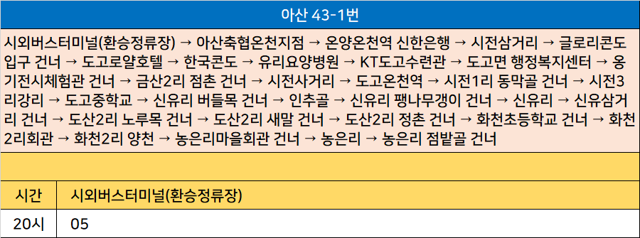 아산 43번: 시외버스터미널(환승정류장) → 아산축협온천지점 → 온양온천역 신한은행 → 시전삼거리 → 글로리콘도입구 건너 → 도고로얄호텔 → 한국콘도 → 유리요양병원 → KT도고수련관 → 도고면 행정복지센터 → 옹기전시체험관 건너 → 금산2리 점촌 건너 → 시전사거리 → 도고온천역 → 시전1리 동막골 건너 → 시전3리강리 → 도고중학교 → 신유리 버들목 건너 → 인추골 → 신유리 팽나무갱이 건너 → 신유리 → 신유삼거리 건너 → 도산2리 노루목 건너 → 도산2리 새말 건너 → 도산2리 정촌 건너 → 오암2리구암말 건너 → 오암2리회관 → 오암2리구암말 → 화천초등학교 건너 → 오암1리 아랫오리실 건너 → 오암1리회관 건너 → 오암1리 윗오리실 → 오암1리회관 → 오암1리 아랫오리실 → 화천리 대천 → 화천1리회관 → 화천1리 → 화천1리회차지 → 화천2리회관 → 화천2리 양천 → 농은리마을회관 건너 → 농은리 → 농은리 점밭골 건너 → 농은리 점밭골 → 농은리 건너 → 농은리마을회관 → 화천2리 양천 건너 → 화천2리회관 건너 → 오암1리 아랫오리실 건너 → 오암1리회관 건너 → 오암1리 윗오리실 → 오암1리회관 → 오암1리 아랫오리실 → 화천리 대천 → 화천1리회관 → 화천1리 → 화천1리회차지 → 화천초등학교 → 오암2리구암말 건너 → 오암2리회관 → 오암2리구암말 → 도산2리 정촌 → 도산2리 새말 → 도산2리 노루목 → 신유리 입구 → 신유리 → 신유리 팽나무갱이 → 인추골 건너 → 신유리 버들목 → 도고중학교 건너 → 시전3리 강리 → 시전1리 동막골 → 도고온천역 → 시전사거리 → 금산2리 점촌 → 옹기전시체험관 → 도고면 행정복지센터 건너 → 기곡2리 → 유리요양병원 건너 → 한국콘도 건너 → 도고로얄호텔 건너 → 글로리콘도입구 → 시전삼거리 건너 → 온양온천역 입구 → 온양온천역 유엘시티 → 고속버스터미널