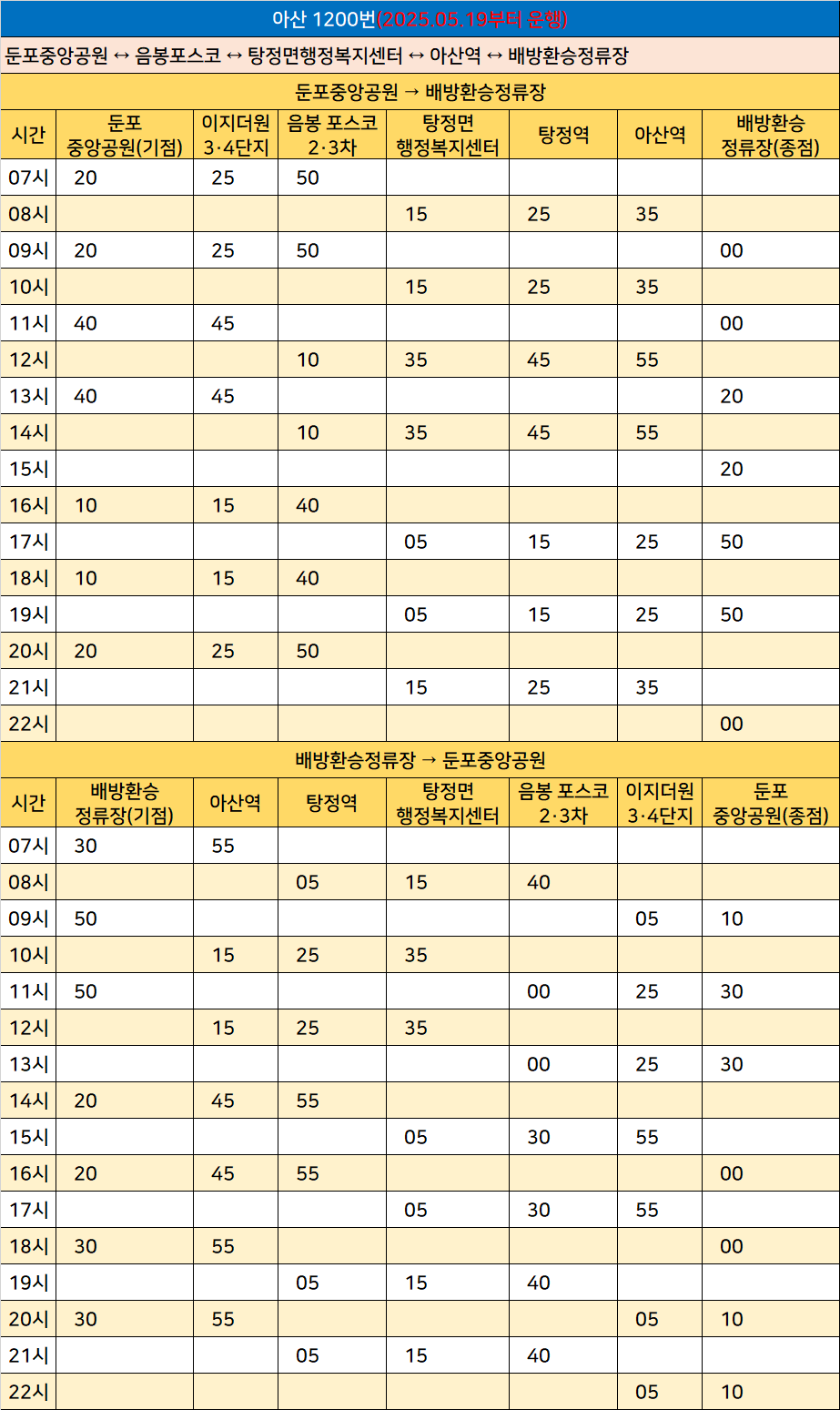 아산 1200번: 둔포중앙공원 ↔ 음봉포스코 ↔ 탕정면행정복지센터 ↔ 아산역 ↔ 배방환승정류장