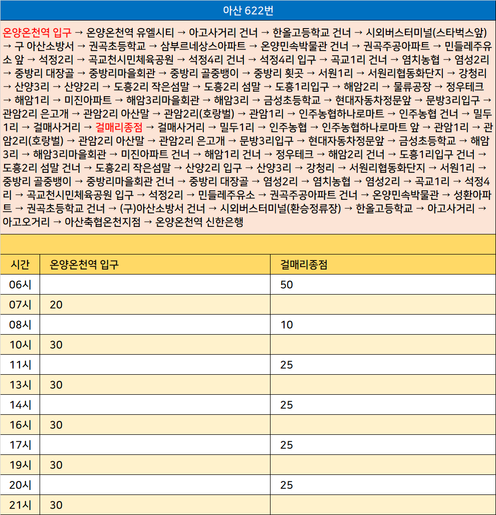 아산 622번: 온양온천역 입구 → 온양온천역 유엘시티 → 아고사거리 건너 → 한올고등학교 건너 → 시외버스터미널(스타벅스앞) → 구 아산소방서 → 권곡초등학교 → 삼부르네상스아파트 → 온양민속박물관 건너 → 권곡주공아파트 → 민들레주유소 앞 → 석정2리 → 곡교천시민체육공원 → 석정4리 건너 → 석정4리 입구 → 곡교1리 건너 → 염치농협 → 염성2리 → 중방리 대장골 → 중방리마을회관 → 중방리 골중뱅이 → 중방리 횟곳 → 서원1리 → 서원리협동화단지 → 강청리 → 산양3리 → 산양2리 → 도흥2리 작은섬말 → 도흥2리 섬말 → 도흥1리입구 → 해암2리 → 물류공장 → 정우테크 → 해암1리 → 미진아파트 → 해암3리마을회관 → 해암3리 → 금성초등학교 → 현대자동차정문앞 → 문방3리입구 → 관암2리 은고개 → 관암2리 아산말 → 관암2리(호랑벌) → 관암1리 → 인주농협하나로마트 → 인주농협 건너 → 밀두1리 → 걸매사거리 → 걸매리종점 → 걸매사거리 → 밀두1리 → 인주농협 → 인주농협하나로마트 앞 → 관암1리 → 관암2리(호랑벌) → 관암2리 아산말 → 관암2리 은고개 → 문방3리입구 → 현대자동차정문앞 → 금성초등학교 → 해암3리 → 해암3리마을회관 → 미진아파트 건너 → 해암1리 건너 → 정우테크 → 해암2리 건너 → 도흥1리입구 건너 → 도흥2리 섬말 건너 → 도흥2리 작은섬말 → 산양2리 입구 → 산양3리 → 강청리 → 서원리협동화단지 → 서원1리 → 중방리 골중뱅이 → 중방리마을회관 건너 → 중방리 대장골 → 염성2리 → 염치농협 → 염성2리 → 곡교1리 → 석정4리 → 곡교천시민체육공원 입구 → 석정2리 → 민들레주유소 → 권곡주공아파트 건너 → 온양민속박물관 → 성환아파트 → 권곡초등학교 건너 → (구)아산소방서 건너 → 시외버스터미널(환승정류장) → 한올고등학교 → 아고사거리 → 아고오거리 → 아산축협온천지점 → 온양온천역 신한은행