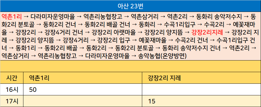 아산 23번: 역촌1리 → 다라미자운영마을 → 역촌리농협창고 → 역촌삼거리 → 역촌2리 → 동화리 송악저수지 → 동화2리 분토골 → 동화2리 건너 → 동화2리 배골 건너 → 동화리 → 수곡1리입구 → 수곡2리 → 예꽃재마을 → 강장2리 → 강장4거리 건너 → 강장2리 아랫마을 → 강장2리 양지뜸 → 강장2리지레 → 강장2리 지레 → 강장2리 양지뜸 → 강장4거리 → 강장2리 입구 → 예꽃재마을 → 수곡2리 건너 → 수곡1리입구 건너 → 동화1리 → 동화2리 배골 → 동화2리 → 동화2리 분토골 → 동화리 송악저수지 건너 → 역촌2리 → 역촌삼거리 → 역촌리농협창고 → 다라미자운영마을 → 송악농협(온양방면)