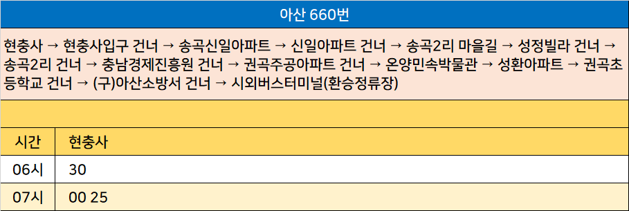 아산 660번: 현충사 → 현충사입구 건너 → 송곡신일아파트 → 신일아파트 건너 → 송곡2리 마을길 → 성정빌라 건너 → 송곡2리 건너 → 충남경제진흥원 건너 → 권곡주공아파트 건너 → 온양민속박물관 → 성환아파트 → 권곡초등학교 건너 → (구)아산소방서 건너 → 시외버스터미널(환승정류장)