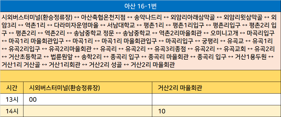 아산 16-1번: 시외버스터미널(환승정류장) ↔ 아산축협온천지점 ↔ 송악나드리 ↔ 외암리아래삼막골 ↔ 외암리윗삼막골 ↔ 외암3리 ↔ 역촌1리 ↔ 다라미자운영마을 ↔ 서남대학교 ↔ 평촌1리 ↔ 평촌1리입구 ↔ 평촌리입구 ↔ 평촌2리 입구 ↔ 평촌2리 ↔ 역촌2리 ↔ 송남중학교 정문 ↔ 송남중학교 ↔ 역촌2리마을회관 ↔ 오미니고개 ↔ 마곡리입구 ↔ 마곡1리 마을회관입구 ↔ 마곡1리 ↔ 마곡1리 마을회관입구 ↔ 마곡리입구 ↔ 궁평리 ↔ 유곡교 ↔ 유곡1리 ↔ 유곡2리입구 ↔ 유곡2리마을회관 ↔ 유곡리 ↔ 유곡2리 ↔ 유곡3리종점 ↔ 유곡2리 ↔ 유곡교회 ↔ 유곡2리 ↔ 거산초등학교 ↔ 법륜원앞 ↔ 송학2리 ↔ 종곡리 입구 ↔ 종곡리 마을회관 ↔ 종곡리 입구 ↔ 거산1용두원 ↔ 거산1리 거산골 ↔ 거산1리회관 ↔ 거산2리 성골 ↔ 거산2리 마을회관