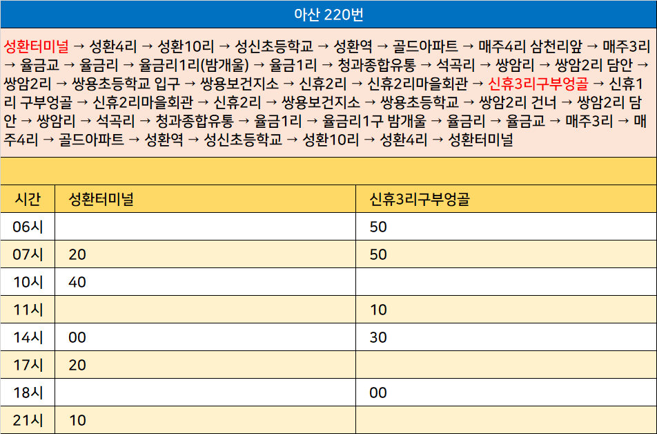 아산 220번: 성환터미널 → 성환4리 → 성환10리 → 성신초등학교 → 성환역 → 골드아파트 → 매주4리 삼천리앞 → 매주3리 → 율금교 → 율금리 → 율금리1리(밤개울) → 율금1리 → 청과종합유통 → 석곡리 → 쌍암리 → 쌍암2리 담안 → 쌍암2리 → 쌍용초등학교 입구 → 쌍용보건지소 → 신휴2리 → 신휴2리마을회관 → 신휴3리구부엉골 → 신휴1리 구부엉골 → 신휴2리마을회관 → 신휴2리 → 쌍용보건지소 → 쌍용초등학교 → 쌍암2리 건너 → 쌍암2리 담안 → 쌍암리 → 석곡리 → 청과종합유통 → 율금1리 → 율금리1구 밤개울 → 율금리 → 율금교 → 매주3리 → 매주4리 → 골드아파트 → 성환역 → 성신초등학교 → 성환10리 → 성환4리 → 성환터미널