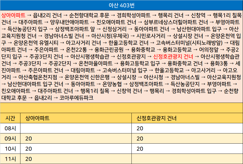 아산 403번: 상아아파트 → 읍내2리 건너 → 순천향대학교 후문 → 경희학성아파트 → 행목리 건너 → 신창역 → 행목1리 칠목 건너 → 대주아파트 → 양우내안애아파트 → 친오애아파트 건너 → 삼부르네상스더힐아파트 건너 → 부영아파트 → 득산농공단지 입구 → 삼정백조아파트 앞 → 신정삼거리 → 동아아파트 건너 → 남산현대아파트 입구 → 아산교육지원청 건너 → 경남아너스빌 건너 → 아산시청(우체국) → 시민로사거리 → 상설시장 건너 → 온양온천역 입구 → 온양온천역 유엘시티 → 아고사거리 건너 → 한올고등학교 건너 → 고속버스터미널(시티노래방앞) → 대림아파트 건너 → 주은아파트 → 온천22통 → 용화근린공원 → 용화중학교 → 용화고등학교 → 어의정앞 → 주공2단지 입구 → 주공3단지 건너 → 아산시평생학습관 → 신정호관광지 → 신정호관광지 건너 → 아산시평생학습관 건너 → 주공3단지 → 주공2단지 → 온천마을아파트 → 용화고등학교 입구 → 용화중학교 건너 → 용화3통 → 세진아파트 → 주은아파트 건너 → 대림아파트 → 고속버스터미널 입구 → 한올고등학교 → 아고사거리 → 아고오거리 → 아산축협온천지점 → 온양온천역 신한은행 → 상설시장 → 아산시청 → 경남아너스빌 → 아산교육지원청 → 남산현대아파트 입구 건너 → 동아아파트 → 온양농협 → 삼정백조아파트 → 득산농공단지 → 부영아파트 → 친오애아파트 → 대주아파트 건너 → 행목1리 칠목 → 신창역 건너 → 행목리 → 경희학성아파트 입구 → 순천향대학교 후문 → 읍내2리 → 코아루에듀파크
