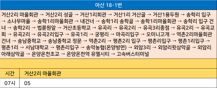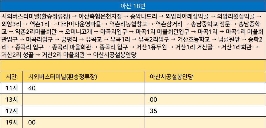아산 18-1번: 거산2리 마을회관 → 거산2리 성골 → 거산1리회관 → 거산1리 거산골 → 거산1용두원 → 송학리 입구 → 소나무마을 → 송학1리마을회관 → 내건너 → 송학1리 송학골 → 송학1리마을회관 → 송학리 입구 건너 → 송학2리 → 법륜원앞 → 거산초등학교 → 유곡리 → 유곡2리 → 유곡3리종점 → 유곡2리 → 유곡교회 → 유곡2리 → 유곡2리입구 → 유곡1리 → 궁평리 → 마곡리입구 → 오미니고개 → 역촌2리마을회관 건너 → 송남중학교 → 송남중학교 정문 → 역촌2리 → 평촌2리 입구 → 평촌리입구 → 평촌1리입구 → 평촌1리 → 서남대학교 → 평촌리입구 → 송악농협(온양방면) → 외암3리 → 외암리윗삼막골 → 외암리아래삼막골 → 온양온천초교 → 온양온천역 유엘시티 → 고속버스터미널