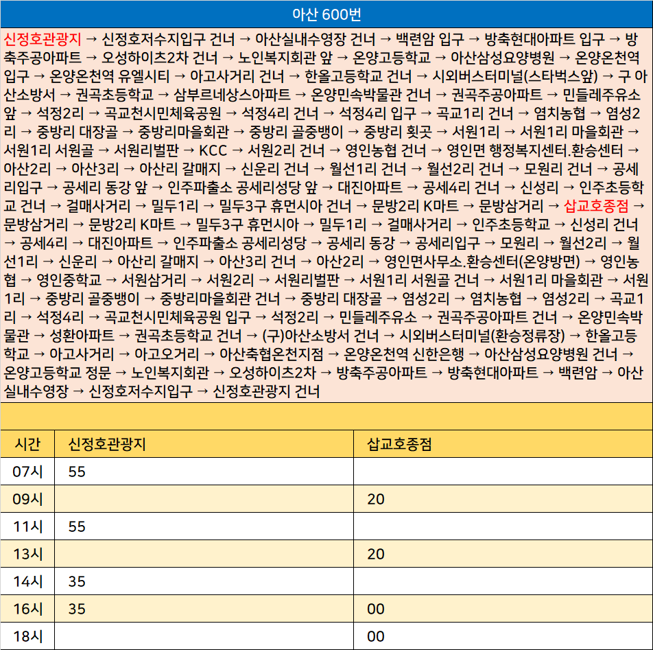 아산 600번: 신정호관광지 → 신정호저수지입구 건너 → 아산실내수영장 건너 → 백련암 입구 → 방축현대아파트 입구 → 방축주공아파트 → 오성하이츠2차 건너 → 노인복지회관 앞 → 온양고등학교 → 아산삼성요양병원 → 온양온천역 입구 → 온양온천역 유엘시티 → 아고사거리 건너 → 한올고등학교 건너 → 시외버스터미널(스타벅스앞) → 구 아산소방서 → 권곡초등학교 → 삼부르네상스아파트 → 온양민속박물관 건너 → 권곡주공아파트 → 민들레주유소 앞 → 석정2리 → 곡교천시민체육공원 → 석정4리 건너 → 석정4리 입구 → 곡교1리 건너 → 염치농협 → 염성2리 → 중방리 대장골 → 중방리마을회관 → 중방리 골중뱅이 → 중방리 횟곳 → 서원1리 → 서원1리 마을회관 → 서원1리 서원골 → 서원리벌판 → KCC → 서원2리 건너 → 영인농협 건너 → 영인면 행정복지센터.환승센터 → 아산2리 → 아산3리 → 아산리 갈매지 → 신운리 건너 → 월선1리 건너 → 월선2리 건너 → 모원리 건너 → 공세리입구 → 공세리 동강 앞 → 인주파출소 공세리성당 앞 → 대진아파트 → 공세4리 건너 → 신성리 → 인주초등학교 건너 → 걸매사거리 → 밀두1리 → 밀두3구 휴먼시아 건너 → 문방2리 K마트 → 문방삼거리 → 삽교호종점 → 문방삼거리 → 문방2리 K마트 → 밀두3구 휴먼시아 → 밀두1리 → 걸매사거리 → 인주초등학교 → 신성리 건너 → 공세4리 → 대진아파트 → 인주파출소 공세리성당 → 공세리 동강 → 공세리입구 → 모원리 → 월선2리 → 월선1리 → 신운리 → 아산리 갈매지 → 아산3리 건너 → 아산2리 → 영인면사무소.환승센터(온양방면) → 영인농협 → 영인중학교 → 서원삼거리 → 서원2리 → 서원리벌판 → 서원1리 서원골 건너 → 서원1리 마을회관 → 서원1리 → 중방리 골중뱅이 → 중방리마을회관 건너 → 중방리 대장골 → 염성2리 → 염치농협 → 염성2리 → 곡교1리 → 석정4리 → 곡교천시민체육공원 입구 → 석정2리 → 민들레주유소 → 권곡주공아파트 건너 → 온양민속박물관 → 성환아파트 → 권곡초등학교 건너 → (구)아산소방서 건너 → 시외버스터미널(환승정류장) → 한올고등학교 → 아고사거리 → 아고오거리 → 아산축협온천지점 → 온양온천역 신한은행 → 아산삼성요양병원 건너 → 온양고등학교 정문 → 노인복지회관 → 오성하이츠2차 → 방축주공아파트 → 방축현대아파트 → 백련암 → 아산실내수영장 → 신정호저수지입구 → 신정호관광지 건너
