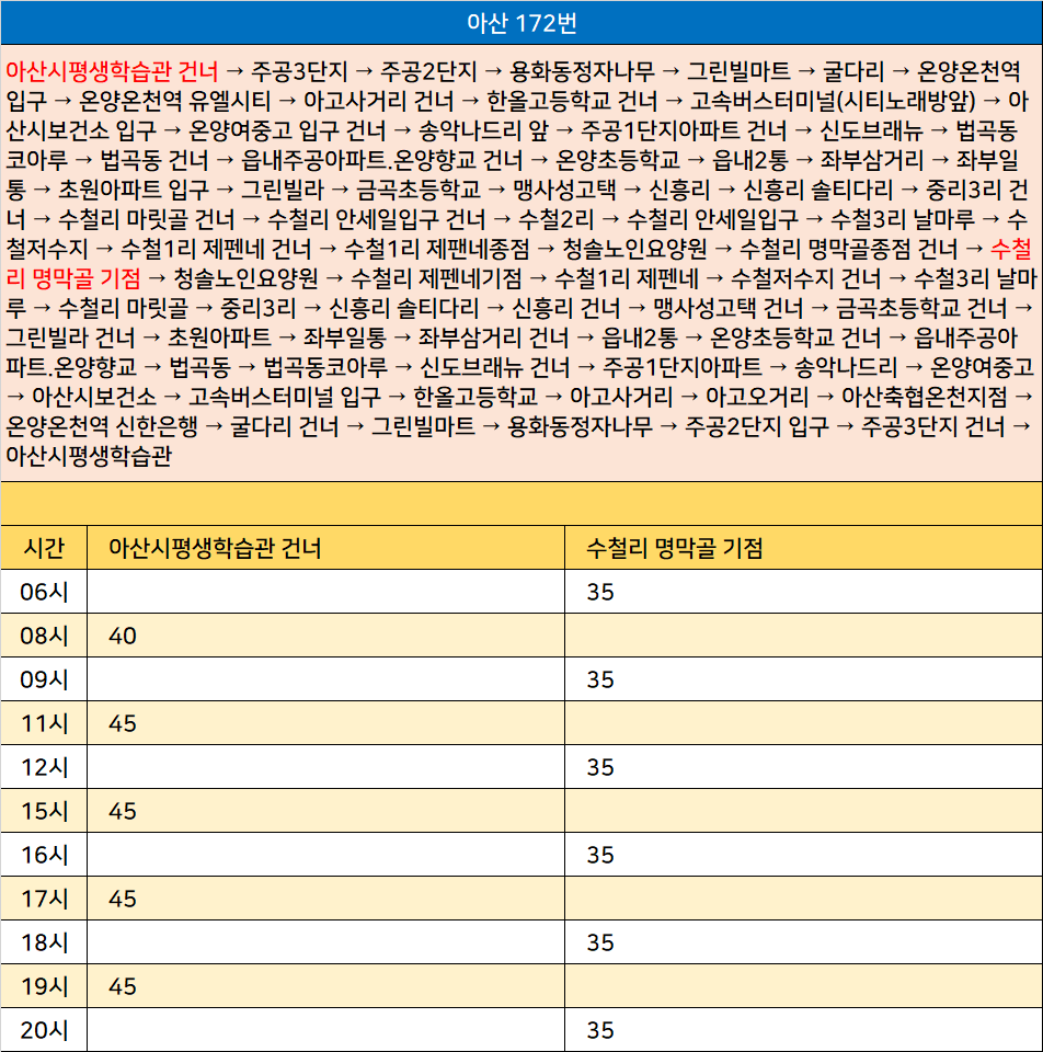아산 172번: 아산시평생학습관 건너 → 주공3단지 → 주공2단지 → 용화동정자나무 → 그린빌마트 → 굴다리 → 온양온천역 입구 → 온양온천역 유엘시티 → 아고사거리 건너 → 한올고등학교 건너 → 고속버스터미널(시티노래방앞) → 아산시보건소 입구 → 온양여중고 입구 건너 → 송악나드리 앞 → 주공1단지아파트 건너 → 신도브래뉴 → 법곡동코아루 → 법곡동 건너 → 읍내주공아파트.온양향교 건너 → 온양초등학교 → 읍내2통 → 좌부삼거리 → 좌부일통 → 초원아파트 입구 → 그린빌라 → 금곡초등학교 → 맹사성고택 → 신흥리 → 신흥리 솔티다리 → 중리3리 건너 → 수철리 마릿골 건너 → 수철리 안세일입구 건너 → 수철2리 → 수철리 안세일입구 → 수철3리 날마루 → 수철저수지 → 수철1리 제펜네 건너 → 수철1리 제팬네종점 → 청솔노인요양원 → 수철리 명막골종점 건너 → 수철리 명막골 기점 → 청솔노인요양원 → 수철리 제펜네기점 → 수철1리 제펜네 → 수철저수지 건너 → 수철3리 날마루 → 수철리 마릿골 → 중리3리 → 신흥리 솔티다리 → 신흥리 건너 → 맹사성고택 건너 → 금곡초등학교 건너 → 그린빌라 건너 → 초원아파트 → 좌부일통 → 좌부삼거리 건너 → 읍내2통 → 온양초등학교 건너 → 읍내주공아파트.온양향교 → 법곡동 → 법곡동코아루 → 신도브래뉴 건너 → 주공1단지아파트 → 송악나드리 → 온양여중고 → 아산시보건소 → 고속버스터미널 입구 → 한올고등학교 → 아고사거리 → 아고오거리 → 아산축협온천지점 → 온양온천역 신한은행 → 굴다리 건너 → 그린빌마트 → 용화동정자나무 → 주공2단지 입구 → 주공3단지 건너 → 아산시평생학습관