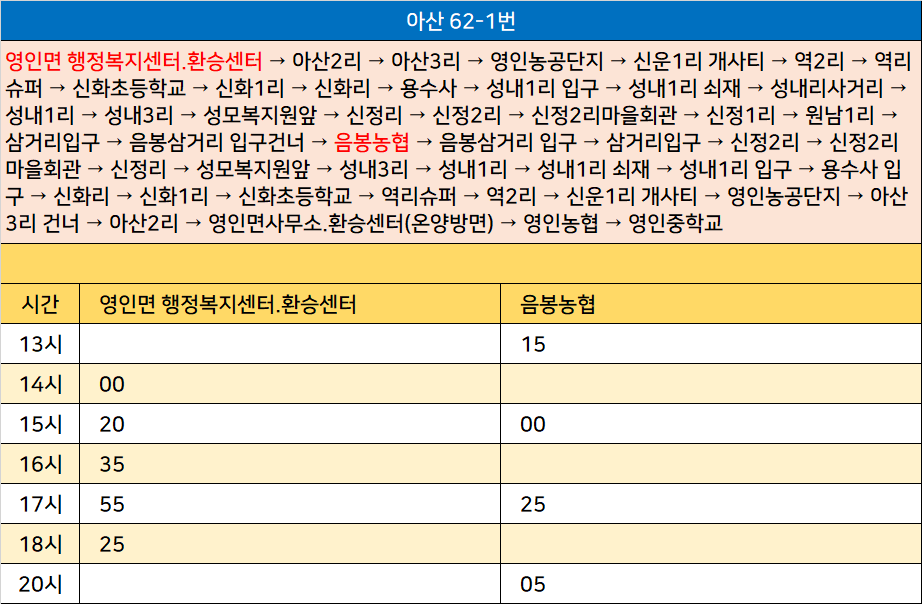 아산 62-1번: 영인면 행정복지센터.환승센터 → 아산2리 → 아산3리 → 영인농공단지 → 신운1리 개사티 → 역2리 → 역리슈퍼 → 신화초등학교 → 신화1리 → 신화리 → 용수사 → 성내1리 입구 → 성내1리 쇠재 → 성내리사거리 → 성내1리 → 성내3리 → 성모복지원앞 → 신정리 → 신정2리 → 신정2리마을회관 → 신정1리 → 원남1리 → 삼거리입구 → 음봉삼거리 입구건너 → 음봉농협 → 음봉삼거리 입구 → 삼거리입구 → 신정2리 → 신정2리마을회관 → 신정리 → 성모복지원앞 → 성내3리 → 성내1리 → 성내1리 쇠재 → 성내1리 입구 → 용수사 입구 → 신화리 → 신화1리 → 신화초등학교 → 역리슈퍼 → 역2리 → 신운1리 개사티 → 영인농공단지 → 아산3리 건너 → 아산2리 → 영인면사무소.환승센터(온양방면) → 영인농협 → 영인중학교