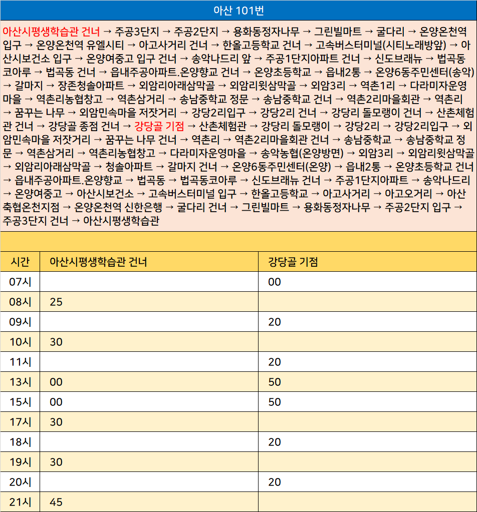 아산 101번: 아산시평생학습관 건너 → 주공3단지 → 주공2단지 → 용화동정자나무 → 그린빌마트 → 굴다리 → 온양온천역 입구 → 온양온천역 유엘시티 → 아고사거리 건너 → 한올고등학교 건너 → 고속버스터미널(시티노래방앞) → 아산시보건소 입구 → 온양여중고 입구 건너 → 송악나드리 앞 → 주공1단지아파트 건너 → 신도브래뉴 → 법곡동코아루 → 법곡동 건너 → 읍내주공아파트.온양향교 건너 → 온양초등학교 → 읍내2통 → 온양6동주민센터(송악) → 갈마지 → 장존청솔아파트 → 외암리아래삼막골 → 외암리윗삼막골 → 외암3리 → 역촌1리 → 다라미자운영마을 → 역촌리농협창고 → 역촌삼거리 → 송남중학교 정문 → 송남중학교 건너 → 역촌2리마을회관 → 역촌리 → 꿈꾸는 나무 → 외암민속마을 저잣거리 → 강당2리입구 → 강당2리 건너 → 강당리 돌모랭이 건너 → 산촌체험관 건너 → 강당골 종점 건너 → 강당골 기점 → 산촌체험관 → 강당리 돌모랭이 → 강당2리 → 강당2리입구 → 외암민속마을 저잣거리 → 꿈꾸는 나무 건너 → 역촌리 → 역촌2리마을회관 건너 → 송남중학교 → 송남중학교 정문 → 역촌삼거리 → 역촌리농협창고 → 다라미자운영마을 → 송악농협(온양방면) → 외암3리 → 외암리윗삼막골 → 외암리아래삼막골 → 청솔아파트 → 갈마지 건너 → 온양6동주민센터(온양) → 읍내2통 → 온양초등학교 건너 → 읍내주공아파트.온양향교 → 법곡동 → 법곡동코아루 → 신도브래뉴 건너 → 주공1단지아파트 → 송악나드리 → 온양여중고 → 아산시보건소 → 고속버스터미널 입구 → 한올고등학교 → 아고사거리 → 아고오거리 → 아산축협온천지점 → 온양온천역 신한은행 → 굴다리 건너 → 그린빌마트 → 용화동정자나무 → 주공2단지 입구 → 주공3단지 건너 → 아산시평생학습관