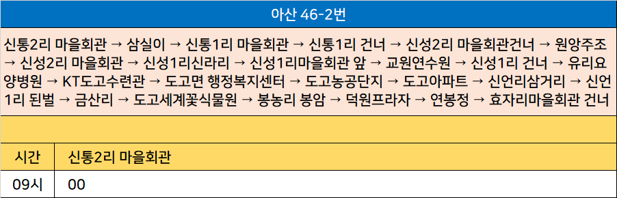 아산 46-2번: 신통2리 마을회관 → 삼실이 → 신통1리 마을회관 → 신통1리 건너 → 신성2리 마을회관건너 → 원앙주조 → 신성2리 마을회관 → 신성1리신라리 → 신성1리마을회관 앞 → 교원연수원 → 신성1리 건너 → 유리요양병원 → KT도고수련관 → 도고면 행정복지센터 → 도고농공단지 → 도고아파트 → 신언리삼거리 → 신언1리 된벌 → 금산리 → 도고세계꽃식물원 → 봉농리 봉암 → 덕원프라자 → 연봉정 → 효자리마을회관 건너