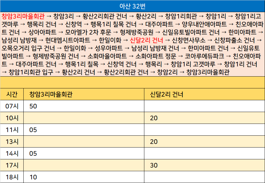 아산 32번: 창암3리마을회관 → 창암3리 → 황산2리회관 건너 → 황산2리 → 창암1리회관 → 창암1리 → 창암1리고갯마루 → 행목리 건너 → 신창역 → 행목1리 칠목 건너 → 대주아파트 → 양우내안애아파트 → 친오애아파트 건너 → 상아아파트 → 모아엘가 2차 후문 → 형제방죽공원 → 신일유토빌아파트 건너 → 한미아파트 → 남성리 남방재 → 현대엠시트아파트 → 한일이화 → 신달2리 건너 → 신창면사무소 → 신창파출소 건너 → 오목오거리 입구 건너 → 한일이화 → 성우아파트 → 남성리 남방재 건너 → 한미아파트 건너 → 신일유토빌아파트 → 형제방죽공원 건너 → 소화마을아파트 → 소화아파트 정문 → 코아루에듀파크 → 친오애아파트 → 대주아파트 건너 → 행목1리 칠목 → 신창역 건너 → 행목리 → 창암1리 고갯마루 → 창암1리 건너 → 창암1리회관 입구 → 황산2리 건너 → 황산2리회관 건너 → 창암2리 → 창암3리마을회관