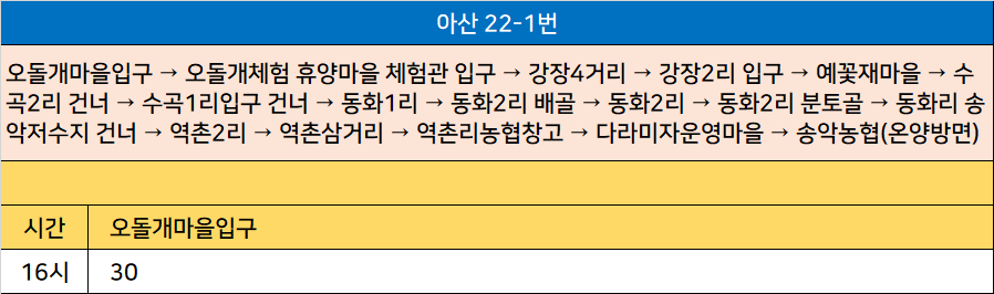 아산 22-1번: 오돌개마을입구 → 오돌개체험 휴양마을 체험관 입구 → 강장4거리 → 강장2리 입구 → 예꽃재마을 → 수곡2리 건너 → 수곡1리입구 건너 → 동화1리 → 동화2리 배골 → 동화2리 → 동화2리 분토골 → 동화리 송악저수지 건너 → 역촌2리 → 역촌삼거리 → 역촌리농협창고 → 다라미자운영마을 → 송악농협(온양방면)