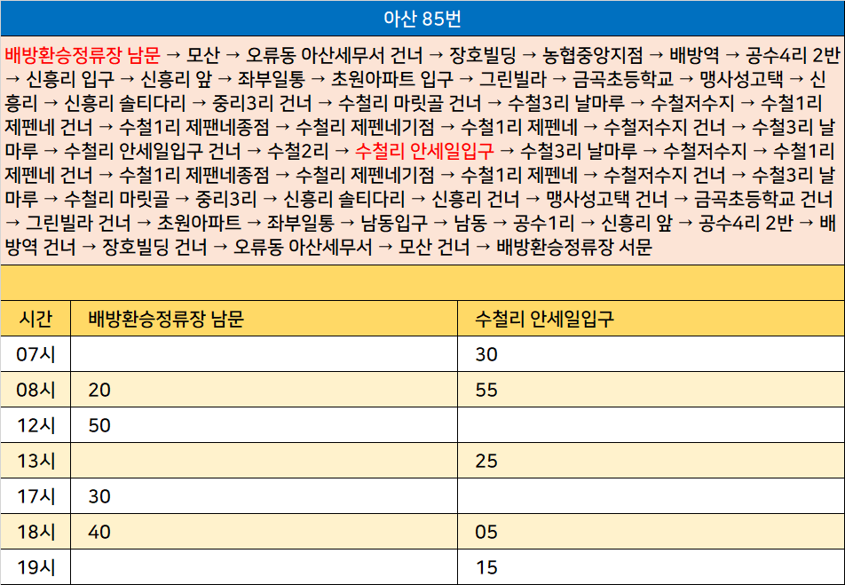 아산 85번: 배방환승정류장 남문 → 모산 → 오류동 아산세무서 건너 → 장호빌딩 → 농협중앙지점 → 배방역 → 공수4리 2반 → 신흥리 입구 → 신흥리 앞 → 좌부일통 → 초원아파트 입구 → 그린빌라 → 금곡초등학교 → 맹사성고택 → 신흥리 → 신흥리 솔티다리 → 중리3리 건너 → 수철리 마릿골 건너 → 수철3리 날마루 → 수철저수지 → 수철1리 제펜네 건너 → 수철1리 제팬네종점 → 수철리 제펜네기점 → 수철1리 제펜네 → 수철저수지 건너 → 수철3리 날마루 → 수철리 안세일입구 건너 → 수철2리 → 수철리 안세일입구 → 수철3리 날마루 → 수철저수지 → 수철1리 제펜네 건너 → 수철1리 제팬네종점 → 수철리 제펜네기점 → 수철1리 제펜네 → 수철저수지 건너 → 수철3리 날마루 → 수철리 마릿골 → 중리3리 → 신흥리 솔티다리 → 신흥리 건너 → 맹사성고택 건너 → 금곡초등학교 건너 → 그린빌라 건너 → 초원아파트 → 좌부일통 → 남동입구 → 남동 → 공수1리 → 신흥리 앞 → 공수4리 2반 → 배방역 건너 → 장호빌딩 건너 → 오류동 아산세무서 → 모산 건너 → 배방환승정류장 서문