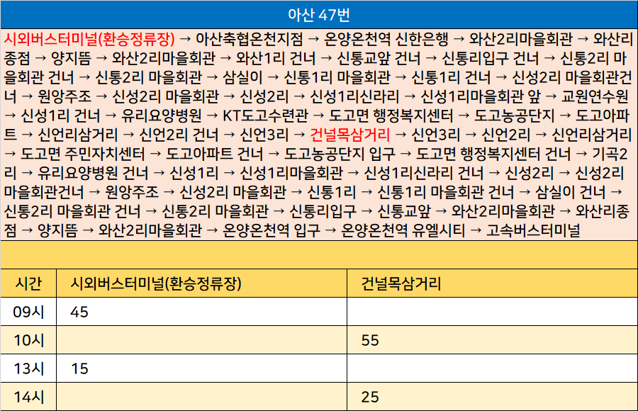 아산 47번: 시외버스터미널(환승정류장) → 아산축협온천지점 → 온양온천역 신한은행 → 와산2리마을회관 → 와산리종점 → 양지뜸 → 와산2리마을회관 → 와산1리 건너 → 신통교앞 건너 → 신통리입구 건너 → 신통2리 마을회관 건너 → 신통2리 마을회관 → 삼실이 → 신통1리 마을회관 → 신통1리 건너 → 신성2리 마을회관건너 → 원앙주조 → 신성2리 마을회관 → 신성2리 → 신성1리신라리 → 신성1리마을회관 앞 → 교원연수원 → 신성1리 건너 → 유리요양병원 → KT도고수련관 → 도고면 행정복지센터 → 도고농공단지 → 도고아파트 → 신언리삼거리 → 신언2리 건너 → 신언3리 → 건널목삼거리 → 신언3리 → 신언2리 → 신언리삼거리 → 도고면 주민자치센터 → 도고아파트 건너 → 도고농공단지 입구 → 도고면 행정복지센터 건너 → 기곡2리 → 유리요양병원 건너 → 신성1리 → 신성1리마을회관 → 신성1리신라리 건너 → 신성2리 → 신성2리 마을회관건너 → 원앙주조 → 신성2리 마을회관 → 신통1리 → 신통1리 마을회관 건너 → 삼실이 건너 → 신통2리 마을회관 건너 → 신통2리 마을회관 → 신통리입구 → 신통교앞 → 와산2리마을회관 → 와산리종점 → 양지뜸 → 와산2리마을회관 → 온양온천역 입구 → 온양온천역 유엘시티 → 고속버스터미널