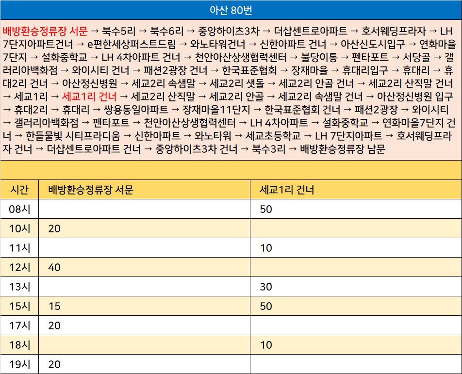아산 80번: 배방환승정류장 서문 → 북수5리 → 북수6리 → 중앙하이츠3차 → 더샵센트로아파트 → 호서웨딩프라자 → LH 7단지아파트건너 → e편한세상퍼스트드림 → 와노타워건너 → 신한아파트 건너 → 아산신도시입구 → 연화마을7단지 → 설화중학교 → LH 4차아파트 건너 → 천안아산상생협력센터 → 불당이통 → 펜타포트 → 서당골 → 갤러리아백화점 → 와이시티 건너 → 패션2광장 건너 → 한국표준협회 → 장재마을 → 휴대리입구 → 휴대리 → 휴대2리 건너 → 아산정신병원 → 세교2리 속샘말 → 세교2리 샛돌 → 세교2리 안골 건너 → 세교2리 산직말 건너 → 세교1리 → 세교1리 건너 → 세교2리 산직말 → 세교2리 안골 → 세교2리 속샘말 건너 → 아산정신병원 입구 → 휴대2리 → 휴대리 → 쌍용동일아파트 → 장재마을11단지 → 한국표준협회 건너 → 패션2광장 → 와이시티 → 갤러리아백화점 → 펜타포트 → 천안아산상생협력센터 → LH 4차아파트 → 설화중학교 → 연화마을7단지 건너 → 한들물빛 시티프라디움 → 신한아파트 → 와노타워 → 세교초등학교 → LH 7단지아파트 → 호서웨딩프라자 건너 → 더샵센트로아파트 건너 → 중앙하이츠3차 건너 → 북수3리 → 배방환승정류장 남문