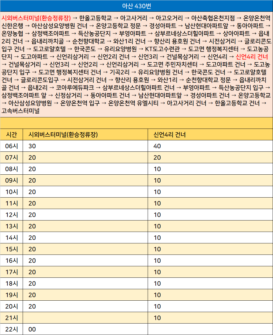 아산 430번: 시외버스터미널(환승정류장) → 한올고등학교 → 아고사거리 → 아고오거리 → 아산축협온천지점 → 온양온천역 신한은행 → 아산삼성요양병원 건너 → 온양고등학교 정문 → 경성아파트 → 남산현대아파트앞 → 동아아파트 → 온양농협 → 삼정백조아파트 → 득산농공단지 → 부영아파트 → 삼부르네상스더힐아파트 → 상아아파트 → 읍내2리 건너 → 읍내리까치골 → 순천향대학교 → 와산1리 건너 → 향산리 용호원 건너 → 시전삼거리 → 글로리콘도입구 건너 → 도고로얄호텔 → 한국콘도 → 유리요양병원 → KT도고수련관 → 도고면 행정복지센터 → 도고농공단지 → 도고아파트 → 신언리삼거리 → 신언2리 건너 → 신언3리 → 건널목삼거리 → 신언4리 → 신언4리 건너 → 건널목삼거리 → 신언3리 → 신언2리 → 신언리삼거리 → 도고면 주민자치센터 → 도고아파트 건너 → 도고농공단지 입구 → 도고면 행정복지센터 건너 → 기곡2리 → 유리요양병원 건너 → 한국콘도 건너 → 도고로얄호텔 건너 → 글로리콘도입구 → 시전삼거리 건너 → 향산리 용호원 → 와산1리 → 순천향대학교 정문 → 읍내리까치골 건너 → 읍내2리 → 코아루에듀파크 → 삼부르네상스더힐아파트 건너 → 부영아파트 → 득산농공단지 입구 → 삼정백조아파트 앞 → 신정삼거리 → 동아아파트 건너 → 남산현대아파트앞 → 경성아파트 건너 → 온양고등학교 → 아산삼성요양병원 → 온양온천역 입구 → 온양온천역 유엘시티 → 아고사거리 건너 → 한올고등학교 건너 → 고속버스터미널