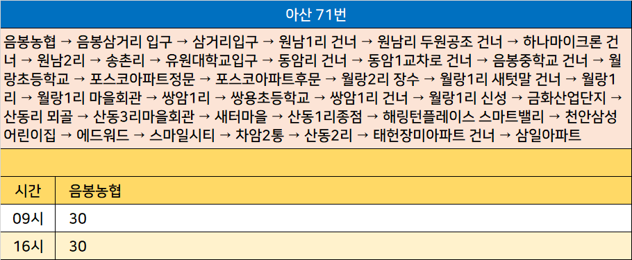 아산 71번: 음봉농협 → 음봉삼거리 입구 → 삼거리입구 → 원남1리 건너 → 원남리 두원공조 건너 → 하나마이크론 건너 → 원남2리 → 송촌리 → 유원대학교입구 → 동암리 건너 → 동암1교차로 건너 → 음봉중학교 건너 → 월랑초등학교 → 포스코아파트정문 → 포스코아파트후문 → 월랑2리 장수 → 월랑1리 새텃말 건너 → 월랑1리 → 월랑1리 마을회관 → 쌍암1리 → 쌍용초등학교 → 쌍암1리 건너 → 월랑1리 신성 → 금화산업단지 → 산동리 뫼골 → 산동3리마을회관 → 새터마을 → 산동1리종점 → 해링턴플레이스 스마트밸리 → 천안삼성어린이집 → 에드워드 → 스마일시티 → 차암2통 → 산동2리 → 태헌장미아파트 건너 → 삼일아파트