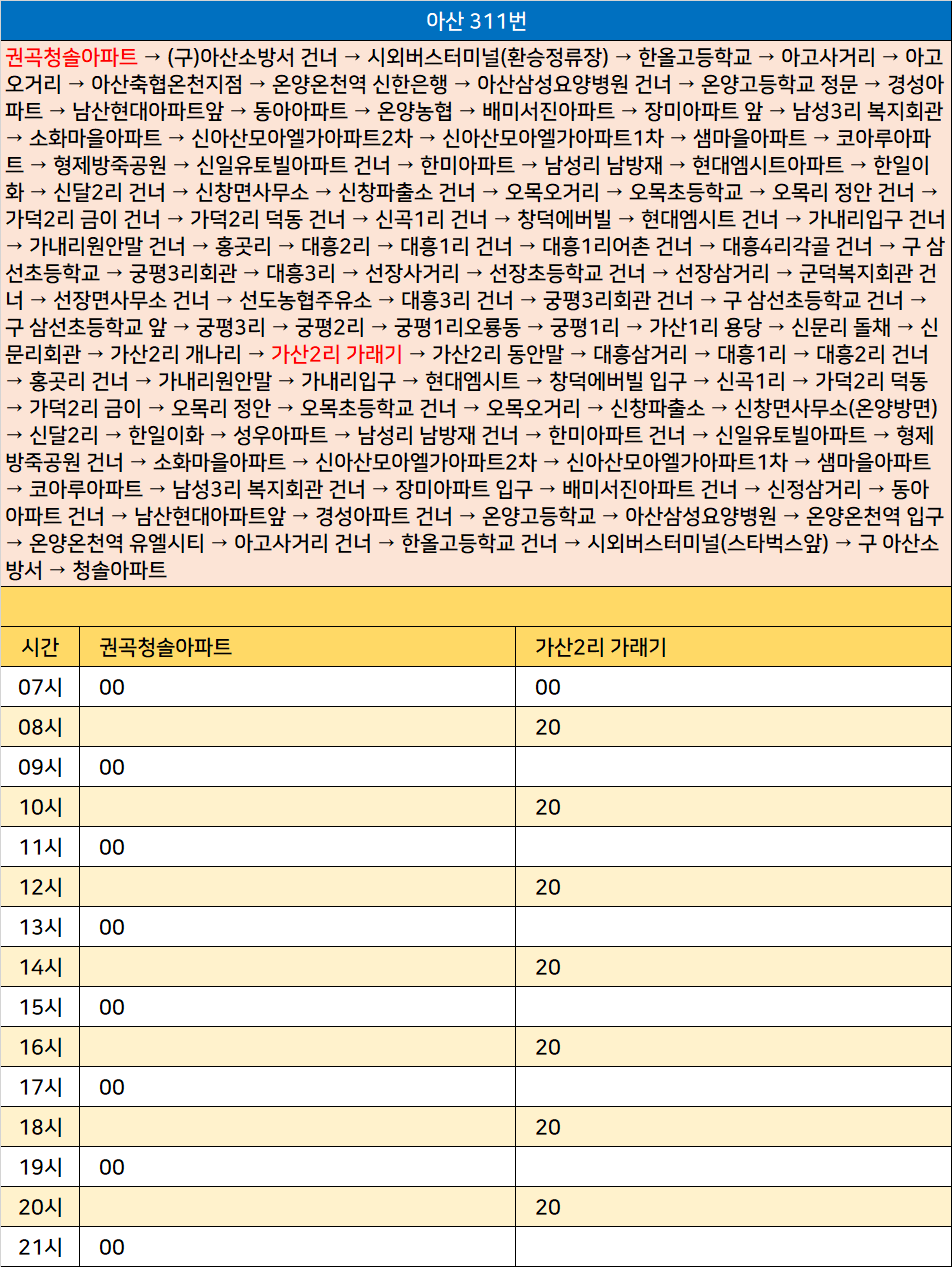아산 311번: 권곡청솔아파트 → (구)아산소방서 건너 → 시외버스터미널(환승정류장) → 한올고등학교 → 아고사거리 → 아고오거리 → 아산축협온천지점 → 온양온천역 신한은행 → 아산삼성요양병원 건너 → 온양고등학교 정문 → 경성아파트 → 남산현대아파트앞 → 동아아파트 → 온양농협 → 배미서진아파트 → 장미아파트 앞 → 남성3리 복지회관 → 소화마을아파트 → 신아산모아엘가아파트2차 → 신아산모아엘가아파트1차 → 샘마을아파트 → 코아루아파트 → 형제방죽공원 → 신일유토빌아파트 건너 → 한미아파트 → 남성리 남방재 → 현대엠시트아파트 → 한일이화 → 신달2리 건너 → 신창면사무소 → 신창파출소 건너 → 오목오거리 → 오목초등학교 → 오목리 정안 건너 → 가덕2리 금이 건너 → 가덕2리 덕동 건너 → 신곡1리 건너 → 창덕에버빌 → 현대엠시트 건너 → 가내리입구 건너 → 가내리원안말 건너 → 홍곳리 → 대흥2리 → 대흥1리 건너 → 대흥1리어촌 건너 → 대흥4리각골 건너 → 구 삼선초등학교 → 궁평3리회관 → 대흥3리 → 선장사거리 → 선장초등학교 건너 → 선장삼거리 → 군덕복지회관 건너 → 선장면사무소 건너 → 선도농협주유소 → 대흥3리 건너 → 궁평3리회관 건너 → 구 삼선초등학교 건너 → 구 삼선초등학교 앞 → 궁평3리 → 궁평2리 → 궁평1리오룡동 → 궁평1리 → 가산1리 용당 → 신문리 돌채 → 신문리회관 → 가산2리 개나리 → 가산2리 가래기 → 가산2리 동안말 → 대흥삼거리 → 대흥1리 → 대흥2리 건너 → 홍곳리 건너 → 가내리원안말 → 가내리입구 → 현대엠시트 → 창덕에버빌 입구 → 신곡1리 → 가덕2리 덕동 → 가덕2리 금이 → 오목리 정안 → 오목초등학교 건너 → 오목오거리 → 신창파출소 → 신창면사무소(온양방면) → 신달2리 → 한일이화 → 성우아파트 → 남성리 남방재 건너 → 한미아파트 건너 → 신일유토빌아파트 → 형제방죽공원 건너 → 소화마을아파트 → 신아산모아엘가아파트2차 → 신아산모아엘가아파트1차 → 샘마을아파트 → 코아루아파트 → 남성3리 복지회관 건너 → 장미아파트 입구 → 배미서진아파트 건너 → 신정삼거리 → 동아아파트 건너 → 남산현대아파트앞 → 경성아파트 건너 → 온양고등학교 → 아산삼성요양병원 → 온양온천역 입구 → 온양온천역 유엘시티 → 아고사거리 건너 → 한올고등학교 건너 → 시외버스터미널(스타벅스앞) → 구 아산소방서 → 청솔아파트