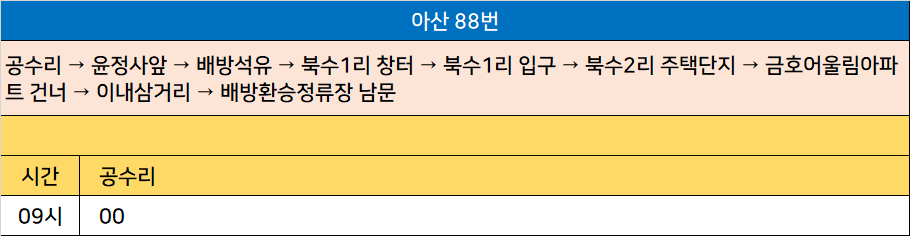 아산 88번: 공수리 → 윤정사앞 → 배방석유 → 북수1리 창터 → 북수1리 입구 → 북수2리 주택단지 → 금호어울림아파트 건너 → 이내삼거리 → 배방환승정류장 남문