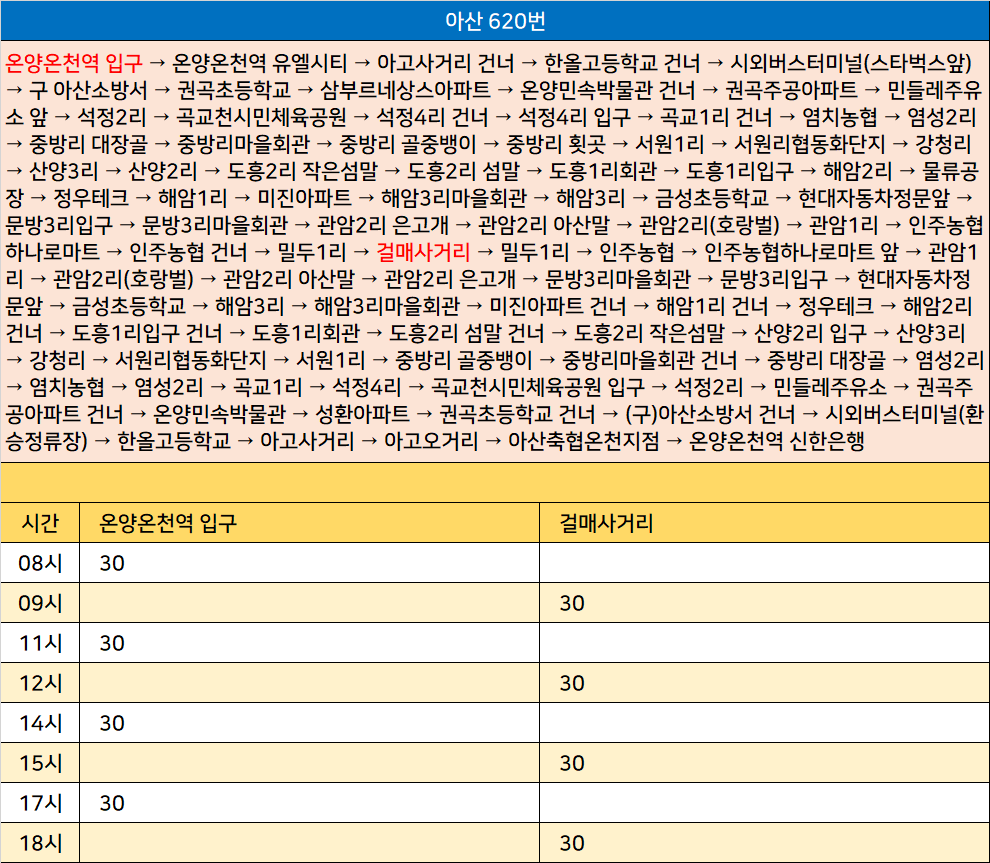 아산 620번: 온양온천역 입구 → 온양온천역 유엘시티 → 아고사거리 건너 → 한올고등학교 건너 → 시외버스터미널(스타벅스앞) → 구 아산소방서 → 권곡초등학교 → 삼부르네상스아파트 → 온양민속박물관 건너 → 권곡주공아파트 → 민들레주유소 앞 → 석정2리 → 곡교천시민체육공원 → 석정4리 건너 → 석정4리 입구 → 곡교1리 건너 → 염치농협 → 염성2리 → 중방리 대장골 → 중방리마을회관 → 중방리 골중뱅이 → 중방리 횟곳 → 서원1리 → 서원리협동화단지 → 강청리 → 산양3리 → 산양2리 → 도흥2리 작은섬말 → 도흥2리 섬말 → 도흥1리회관 → 도흥1리입구 → 해암2리 → 물류공장 → 정우테크 → 해암1리 → 미진아파트 → 해암3리마을회관 → 해암3리 → 금성초등학교 → 현대자동차정문앞 → 문방3리입구 → 문방3리마을회관 → 관암2리 은고개 → 관암2리 아산말 → 관암2리(호랑벌) → 관암1리 → 인주농협하나로마트 → 인주농협 건너 → 밀두1리 → 걸매사거리 → 밀두1리 → 인주농협 → 인주농협하나로마트 앞 → 관암1리 → 관암2리(호랑벌) → 관암2리 아산말 → 관암2리 은고개 → 문방3리마을회관 → 문방3리입구 → 현대자동차정문앞 → 금성초등학교 → 해암3리 → 해암3리마을회관 → 미진아파트 건너 → 해암1리 건너 → 정우테크 → 해암2리 건너 → 도흥1리입구 건너 → 도흥1리회관 → 도흥2리 섬말 건너 → 도흥2리 작은섬말 → 산양2리 입구 → 산양3리 → 강청리 → 서원리협동화단지 → 서원1리 → 중방리 골중뱅이 → 중방리마을회관 건너 → 중방리 대장골 → 염성2리 → 염치농협 → 염성2리 → 곡교1리 → 석정4리 → 곡교천시민체육공원 입구 → 석정2리 → 민들레주유소 → 권곡주공아파트 건너 → 온양민속박물관 → 성환아파트 → 권곡초등학교 건너 → (구)아산소방서 건너 → 시외버스터미널(환승정류장) → 한올고등학교 → 아고사거리 → 아고오거리 → 아산축협온천지점 → 온양온천역 신한은행