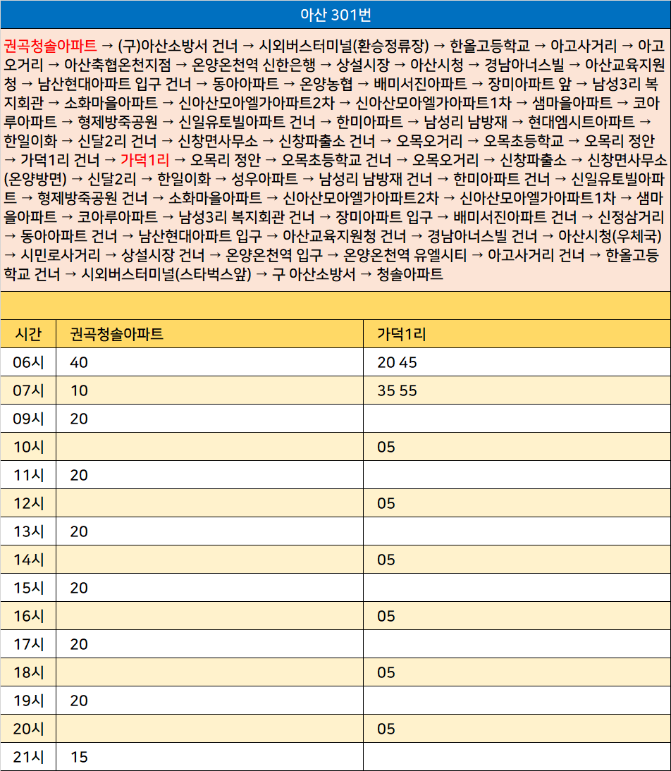 아산 301번: 권곡청솔아파트 → (구)아산소방서 건너 → 시외버스터미널(환승정류장) → 한올고등학교 → 아고사거리 → 아고오거리 → 아산축협온천지점 → 온양온천역 신한은행 → 상설시장 → 아산시청 → 경남아너스빌 → 아산교육지원청 → 남산현대아파트 입구 건너 → 동아아파트 → 온양농협 → 배미서진아파트 → 장미아파트 앞 → 남성3리 복지회관 → 소화마을아파트 → 신아산모아엘가아파트2차 → 신아산모아엘가아파트1차 → 샘마을아파트 → 코아루아파트 → 형제방죽공원 → 신일유토빌아파트 건너 → 한미아파트 → 남성리 남방재 → 현대엠시트아파트 → 한일이화 → 신달2리 건너 → 신창면사무소 → 신창파출소 건너 → 오목오거리 → 오목초등학교 → 오목리 정안 → 가덕1리 건너 → 가덕1리 → 오목리 정안 → 오목초등학교 건너 → 오목오거리 → 신창파출소 → 신창면사무소(온양방면) → 신달2리 → 한일이화 → 성우아파트 → 남성리 남방재 건너 → 한미아파트 건너 → 신일유토빌아파트 → 형제방죽공원 건너 → 소화마을아파트 → 신아산모아엘가아파트2차 → 신아산모아엘가아파트1차 → 샘마을아파트 → 코아루아파트 → 남성3리 복지회관 건너 → 장미아파트 입구 → 배미서진아파트 건너 → 신정삼거리 → 동아아파트 건너 → 남산현대아파트 입구 → 아산교육지원청 건너 → 경남아너스빌 건너 → 아산시청(우체국) → 시민로사거리 → 상설시장 건너 → 온양온천역 입구 → 온양온천역 유엘시티 → 아고사거리 건너 → 한올고등학교 건너 → 시외버스터미널(스타벅스앞) → 구 아산소방서 → 청솔아파트